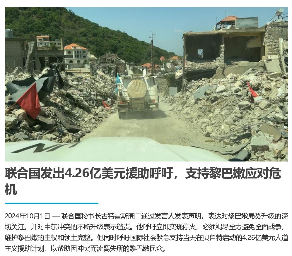 古特雷斯强调,近期事态发展表明,已经到了停止在黎巴嫩的敌对行动、切实采取行动全面执行安理会第1559号和第1701号决议、为实现持久和平的外交努力铺平道路的时候。他同时呼吁立即在加沙地带停火、立即无条件释放所有被扣押人员、向在加沙地带的巴勒斯坦人提供有效人道主义援助,并“不可逆转地”推进“两国方案”。