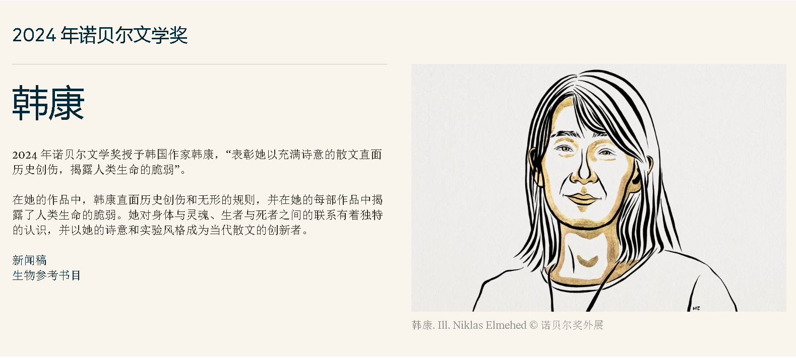 瑞典文学院常任秘书马茨·马尔姆当天在斯德哥尔摩举行的新闻发布会上宣布,2024年诺贝尔文学奖授予韩国作家韩江,以表彰她“用强烈的诗意散文直面历史创伤,揭露人类生命的脆弱”。马尔姆说,已与韩江通电话告知其获奖消息,她没有料到自己会获奖,感到非常荣幸。