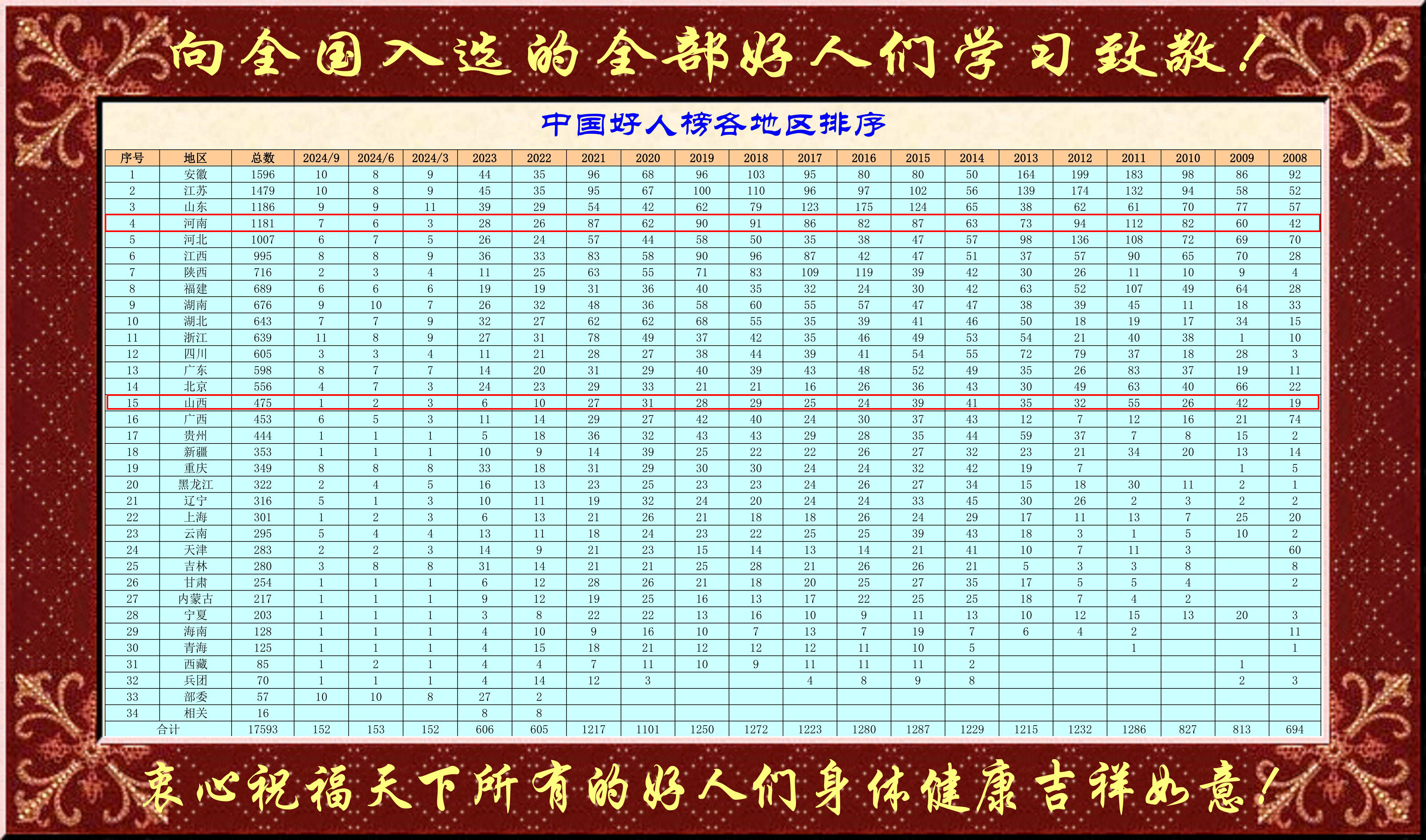 新华社武汉11月12日电(记者宋立崑)2024年第三季度“中国好人榜”发布仪式暨全国道德模范与身边好人现场交流活动12日在湖北十堰市举办。经各地推荐、网友评议和专家评审等环节,共有152人(组)助人为乐、见义勇为、诚实守信、敬业奉献、孝老爱亲的身边好人光荣上榜。