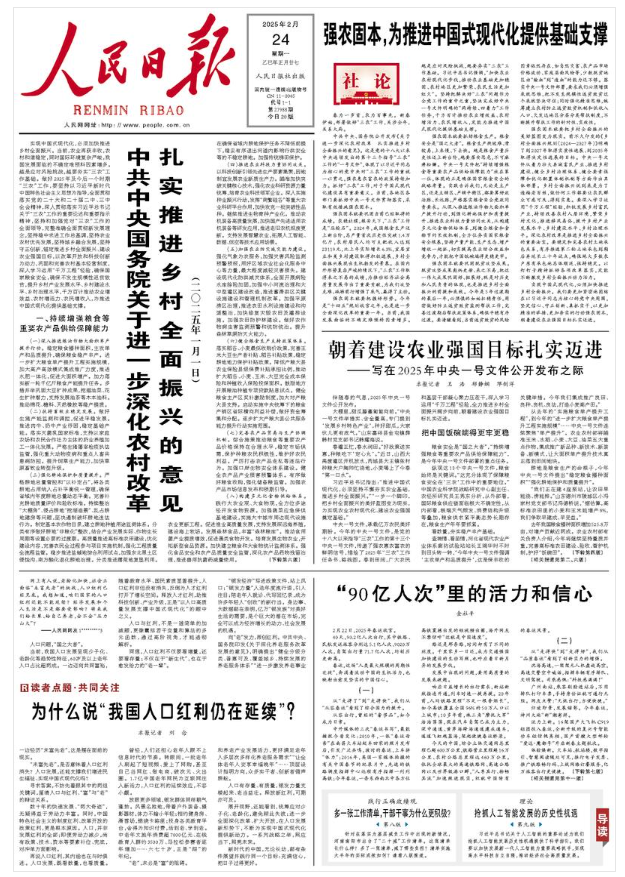中共中央、国务院公开发布《关于进一步深化农村改革 扎实推进乡村全面振兴的意见》。这是党的十八大以来中央连续发出的第十三个指导“三农”工作的“一号文件”,体现了以习近平同志为核心的党中央对“三农”工作的重视一以贯之,强农惠农富农的政策持续加力。抓好“三农”工作,对于中国式现代化建设具有重要意义。当前,各地区各部门要抓好中央一号文件贯彻落实,采取有效措施强农固本。