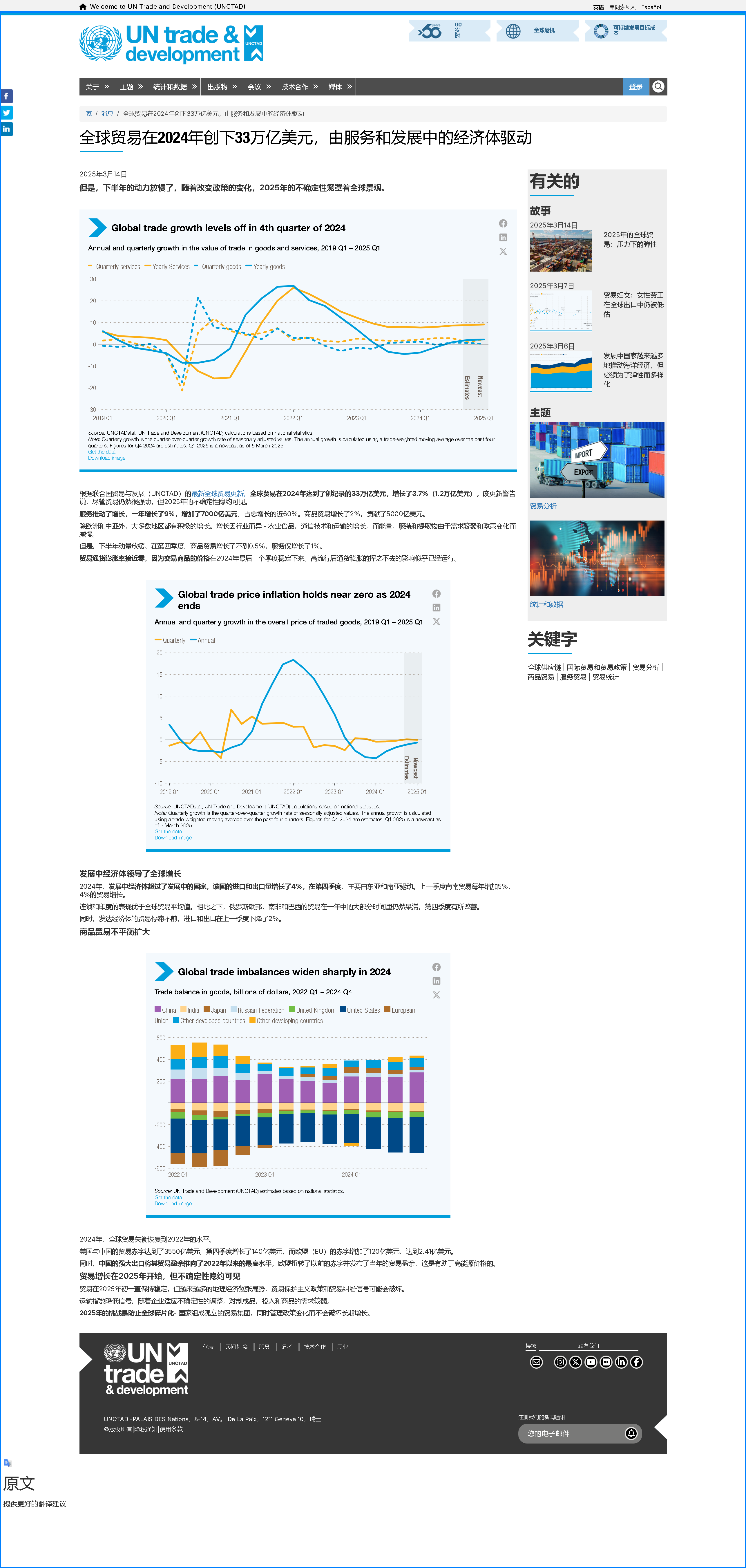 新华社日内瓦3月15日电 联合国贸易和发展会议(贸发会议)14日发布报告显示,2024年全球贸易额达到33万亿美元新高,较2023年增长3.7%,但贸易增长势头在2024年下半年有所放缓。