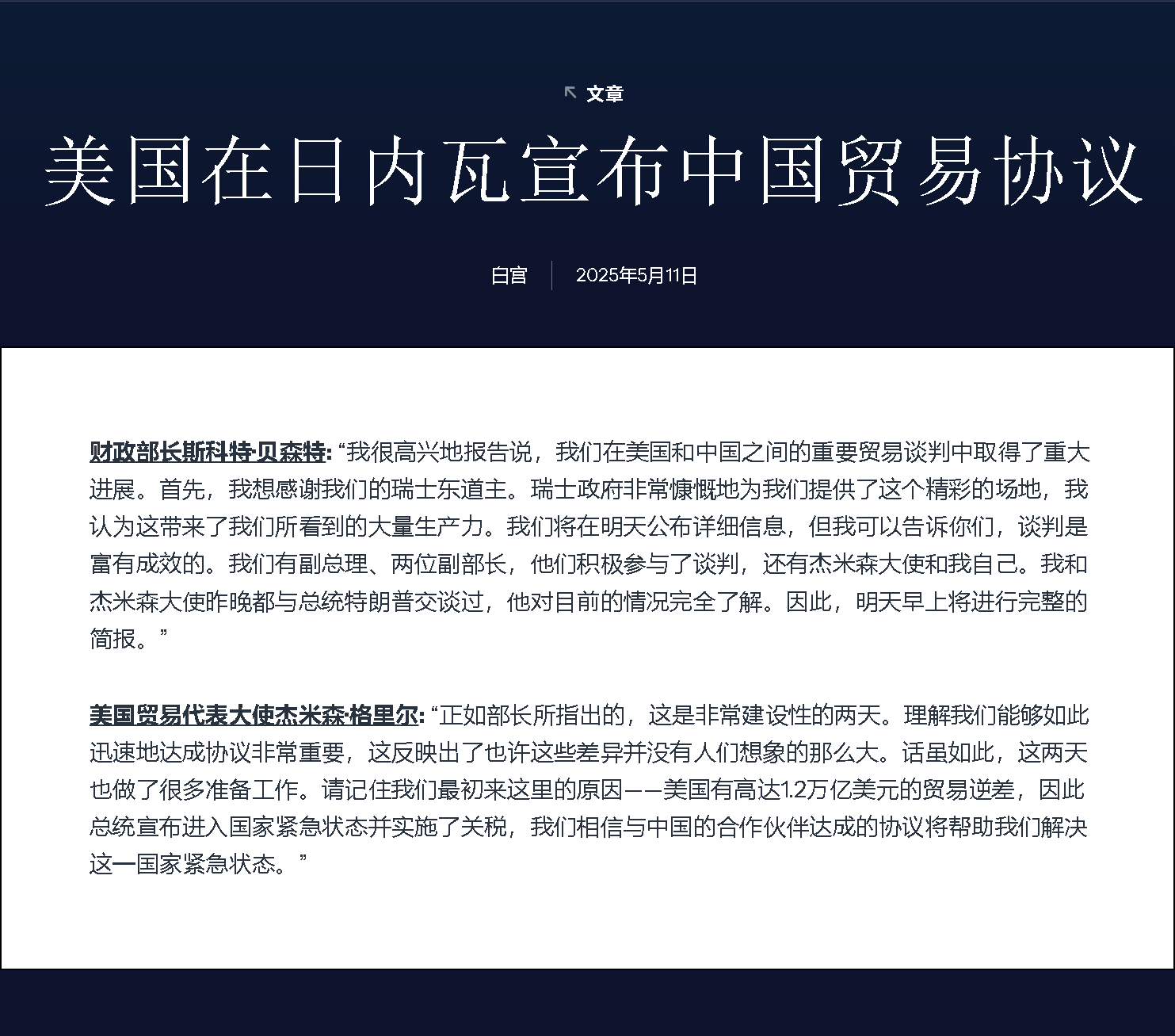 2025年4月以来,美国政府在此前单边加征关税的基础上,又对华加征所谓“对等关税”,中国进行了坚决正当反制。随后美方轮番升级关税措施,将对华“对等关税”税率从第一轮的34%先后提升至84%和125%。美高额关税严重损害双边正常经贸往来,严重破坏国际经贸秩序。本次会谈达成了联合声明,是双方通过平等对话协商解决分歧迈出的重要一步,为进一步弥合分歧和深化合作打下了基础、创造了条件。