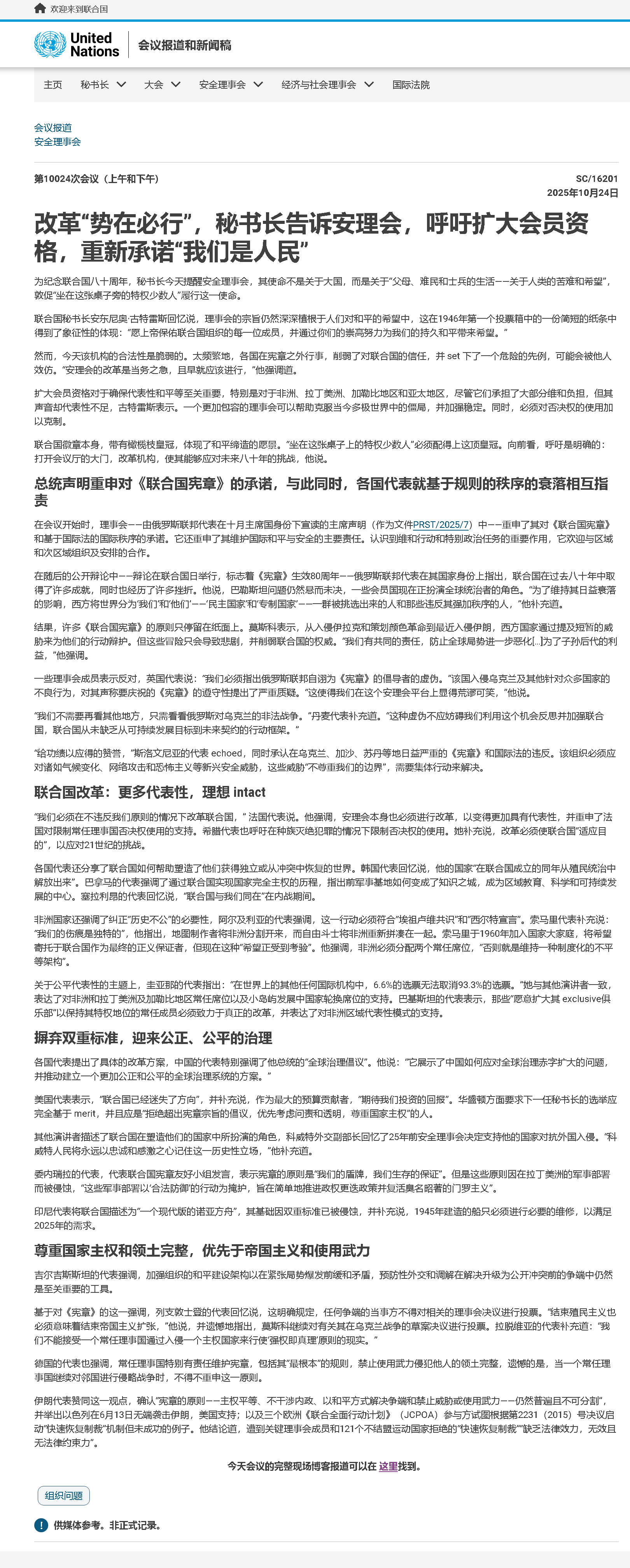 新华社联合国10月24日电 今年10月24日是《联合国宪章》生效80周年纪念日。联合国安理会当天举行“展望联合国未来”公开辩论会。中国常驻联合国代表傅聪在会上发言,他指出中国领导人提出的全球治理倡议对联合国未来发展具有很强的指导意义。
