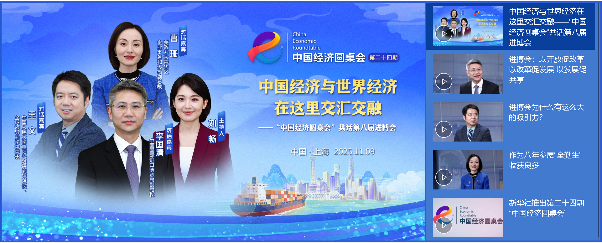 11月9日,新华社推出第二十四期“中国经济圆桌会”大型全媒体访谈节目,邀请中国国际进口博览局副局长李国清,中国人民大学重阳金融研究院院长、全球领导力学院院长王文,美敦力大中华区企业事务和传播副总裁曹珊,共话第八届进博会依托中国大市场为世界经济带来的新机遇。