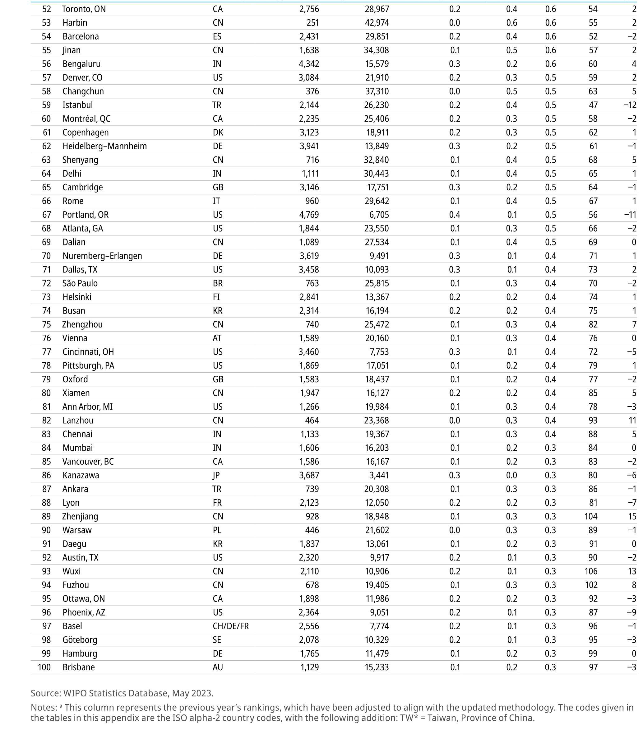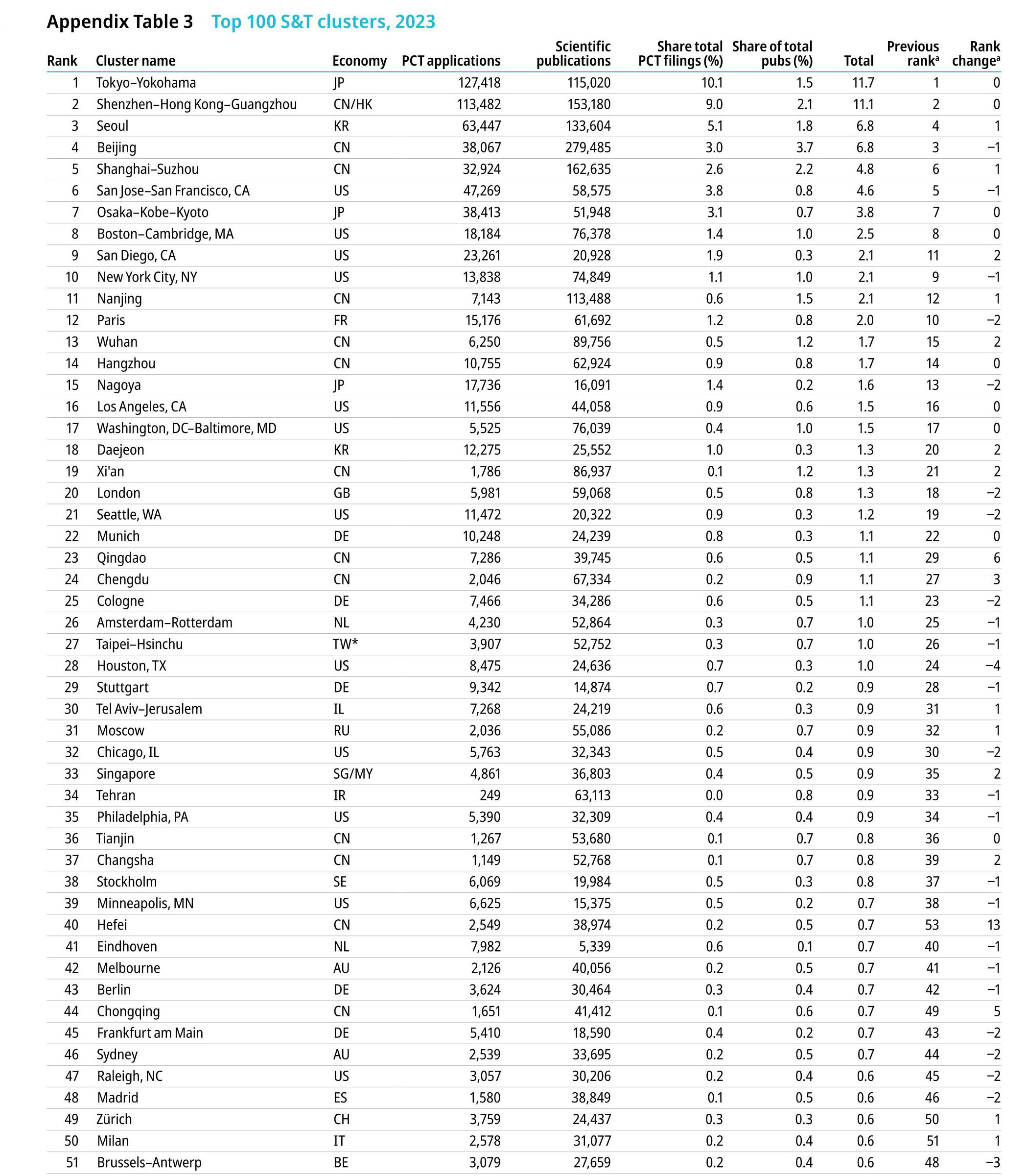 中国有25个科技集群进入全球TOP100榜单,成为拥有全球顶级科技集群最多的国家,并在前五科技集群中占了三位。这25个集群分别为:深圳-香港-广州(第2位)、北京(4)、上海-苏州(5)、南京(11)、武汉(13)、杭州(14)、西安(19)、青岛(23)、成都(24)、台北-新竹(27)、天津(36)、长沙(37)、合肥(40)、重庆(44)、哈尔滨(53)、济南(55)、长春(58)、沈阳(63)、大连(69)、郑州(75)、厦门(80)、兰州(82)、镇江(89)、无锡(93)、福州(94)。成都本次排名比2022年GII著录排名上升5位。