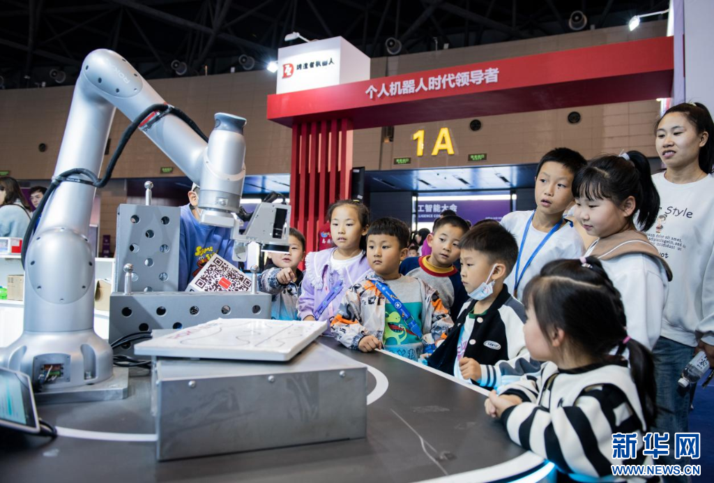 展会上的智能设备吸引孩子们围观。新华网 发(王昕妍 摄)