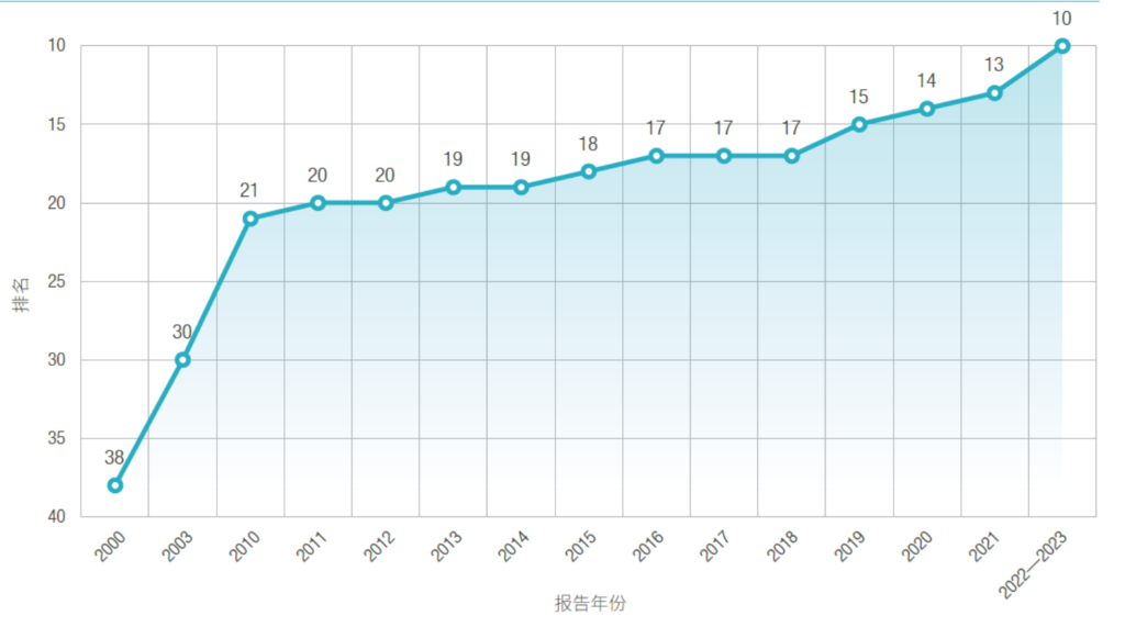 结果显示,2023年,中国国家创新指数综合排名世界第10位,较上期提升3位,是唯一进入前15位的发展中国家。
