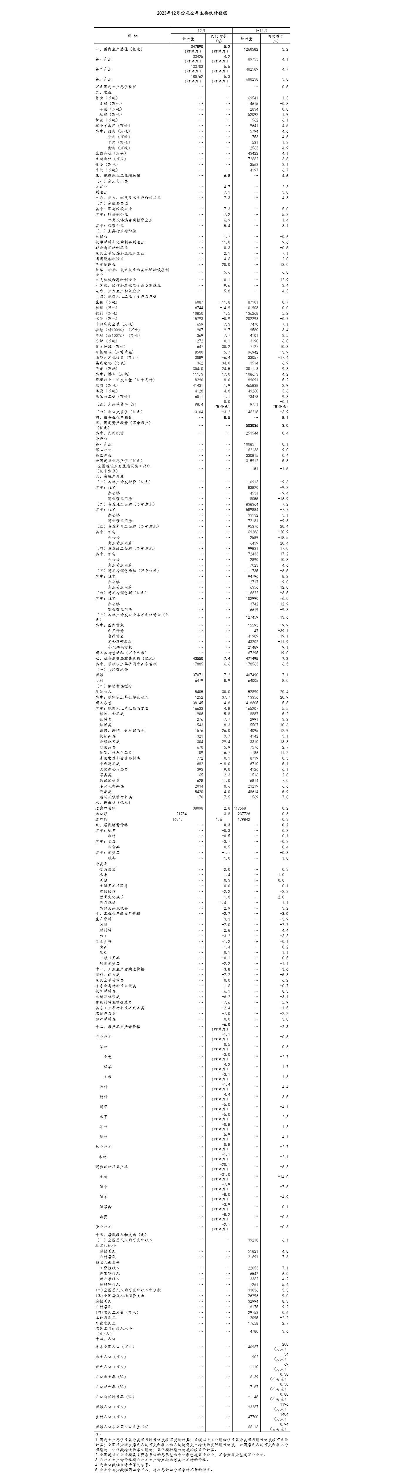(2)根据季节调整模型自动修正结果,对近一年来各期国内生产总值、规模以上工业增加值、固定资产投资(不含农户)、社会消费品零售总额环比增速进行修订。修订结果及2023年四季度GDP环比数据、2023年12月份其他指标环比数据如下: