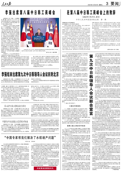 一、中华人民共和国国务院总理李强、日本国首相岸田文雄、大韩民国总统尹锡悦于2024年5月27日在韩国首尔举行第九次中日韩领导人会议。