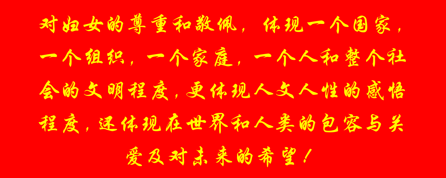 对妇女的尊重和敬佩,体现一个国家,一个组织,一个家庭,一个人和整个社会的文明程度,更体现人文人性的感悟程度,还体现在世界和人类的包容与关爱及对未来的希望!