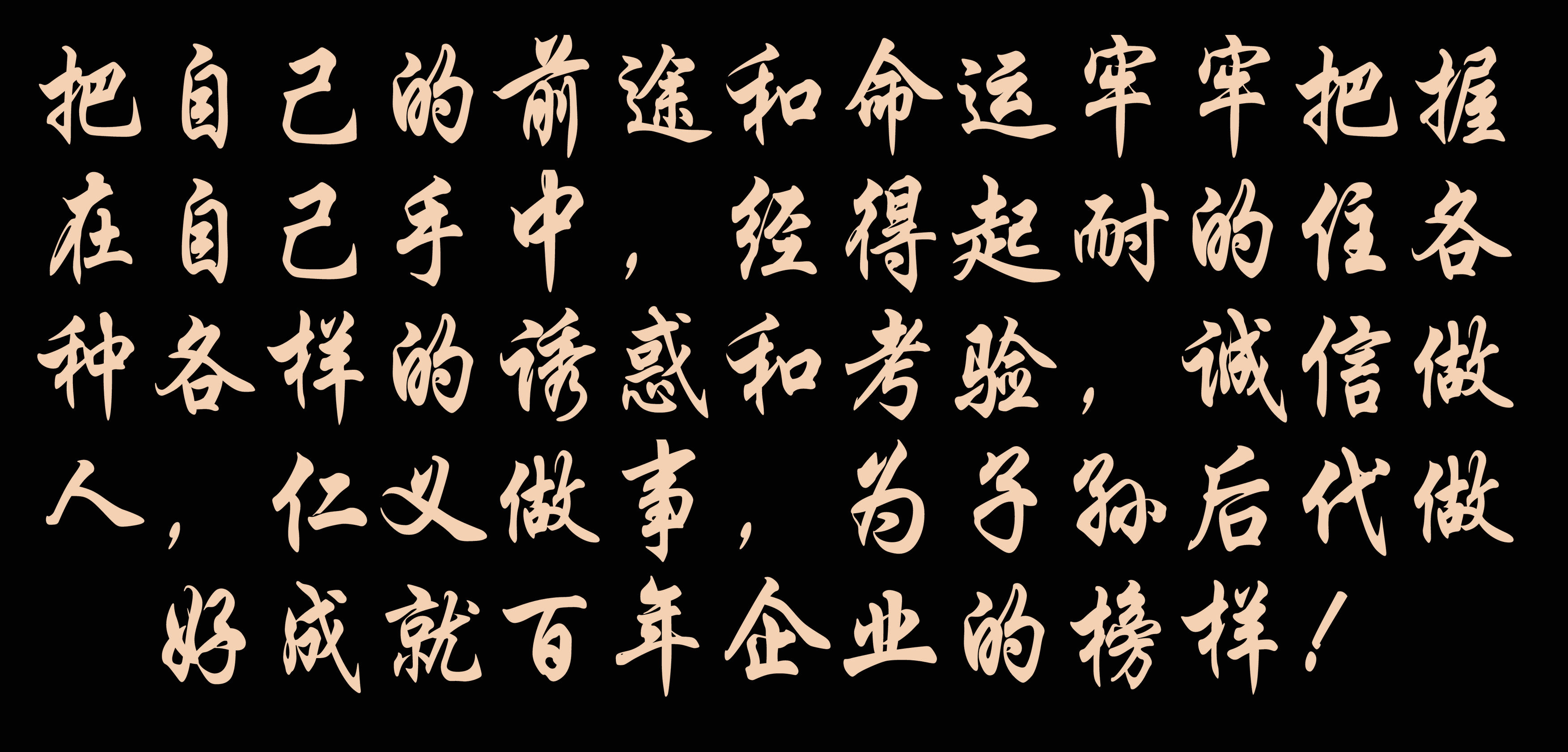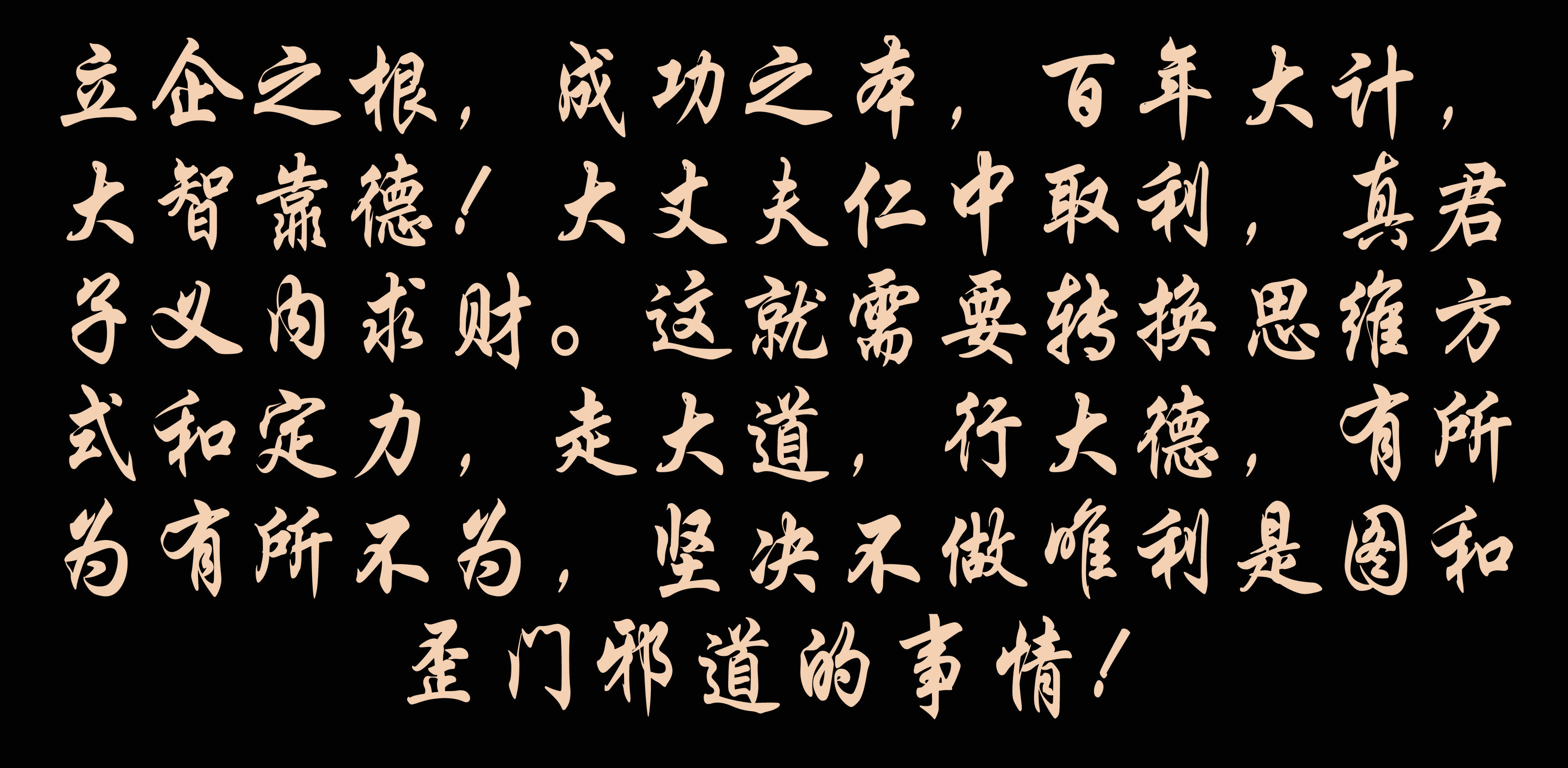 立企之根,成功之本,百年大计,大智靠德!大丈夫仁中取利,真君子义内求财。这就需要转换思维方式和定力,走大道,行大德,有所为有所不为,坚决不做唯利是图和歪门邪道的事情,把自己的前途和命运牢牢把握在自己手中,经得起耐的住各种各样的诱惑和考验,诚信做人,仁义做事,为子孙后代做好成就百年企业的榜样!