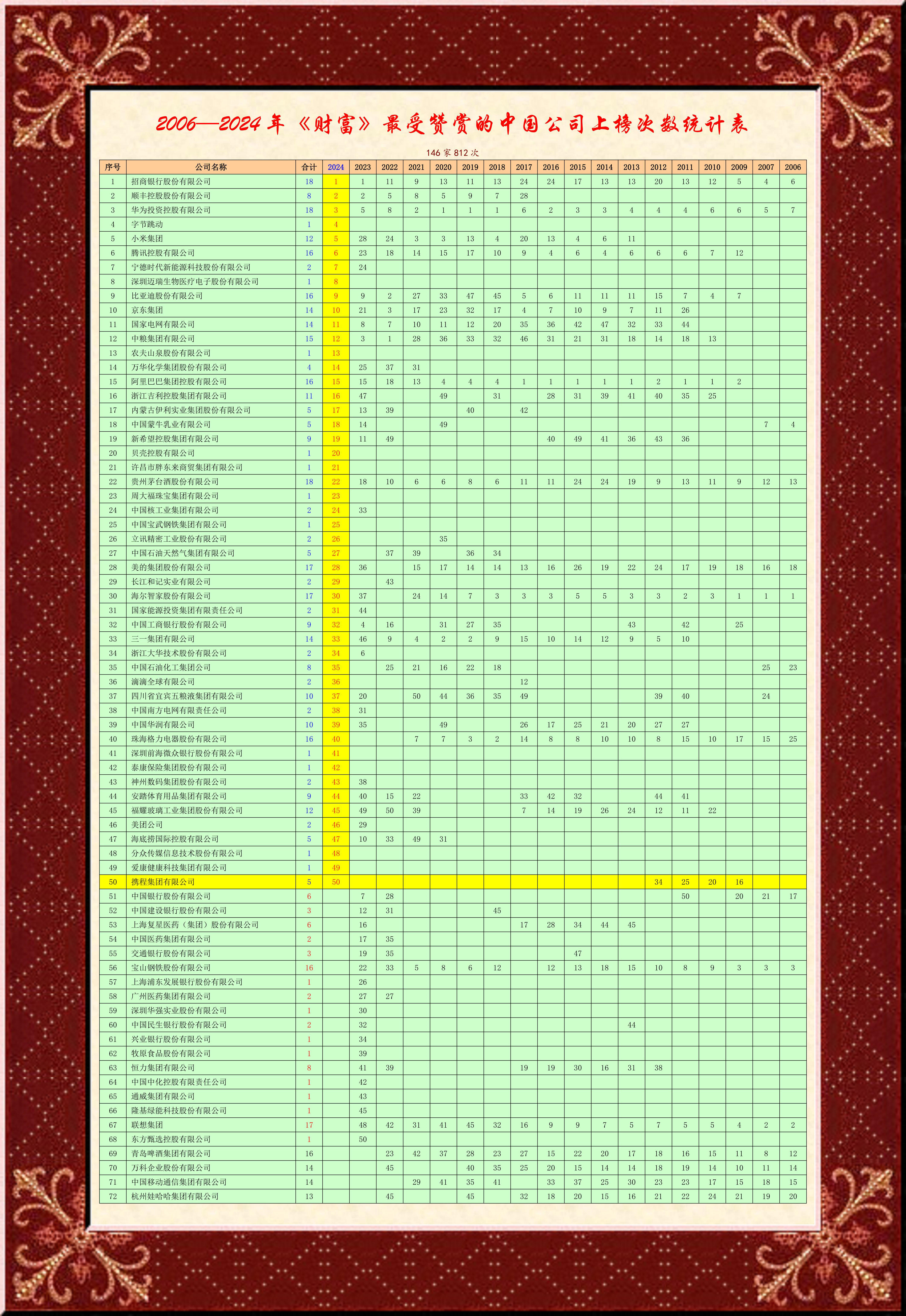 【行业资料】2006-2024《财富》最受赞赏的中国公司