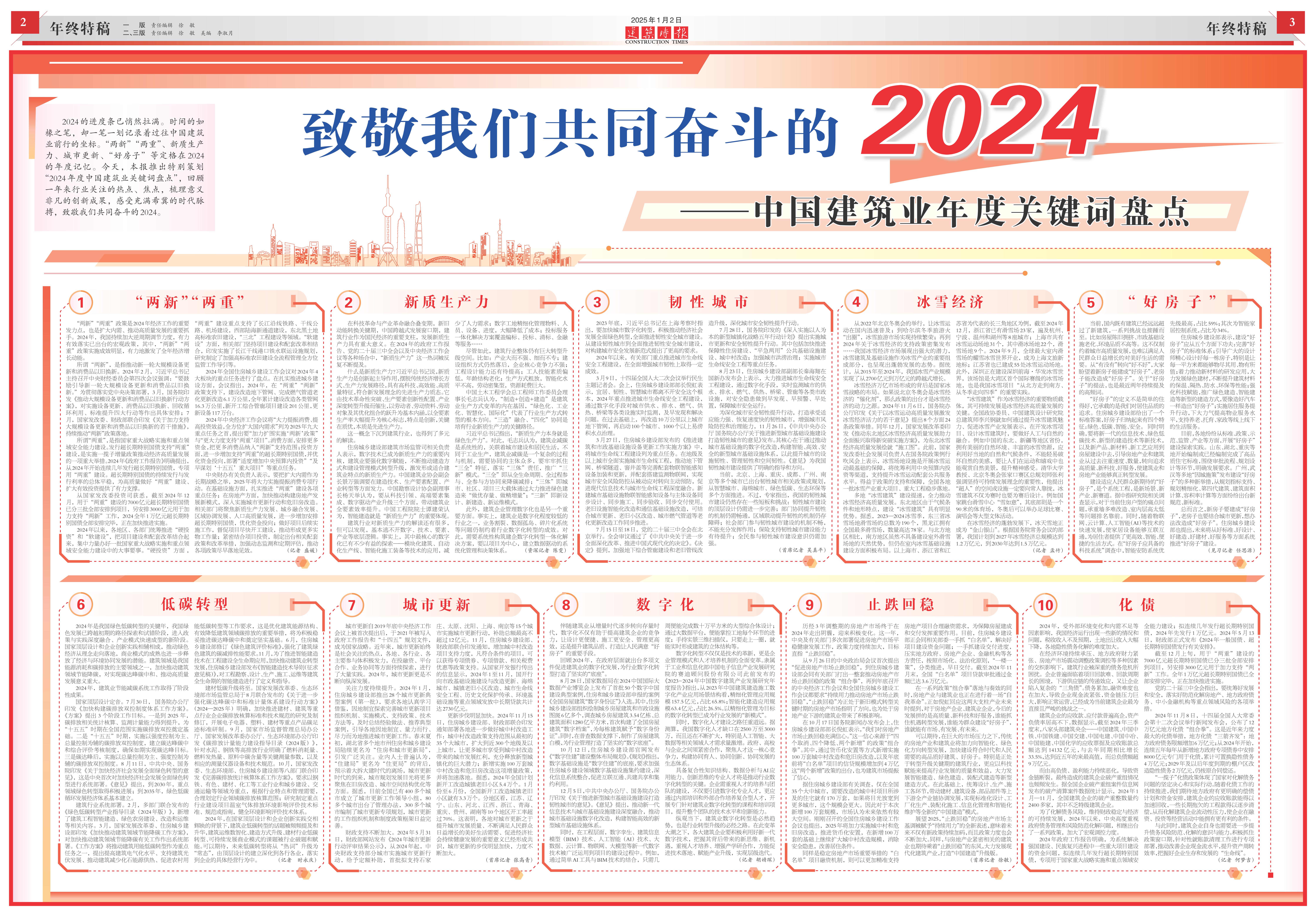 在系统梳理2024年行业热点基础上,《建筑时报》邀请专家学者、行业媒体人士,共同评选出2024年度中国建筑业十大新闻。