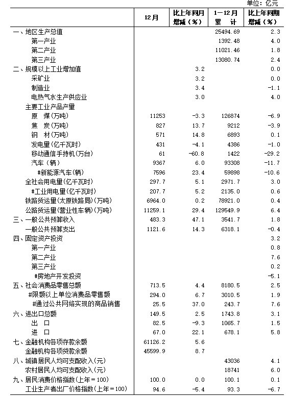 根据地区生产总值统一核算结果,全年全省地区生产总值为25494.69亿元,按不变价格计算,比上年增长2.3%。其中,第一产业增加值为1392.48亿元,增长4.0%;第二产业增加值为11021.46亿元,增长1.8%;第三产业增加值为13080.74亿元,增长2.4%。