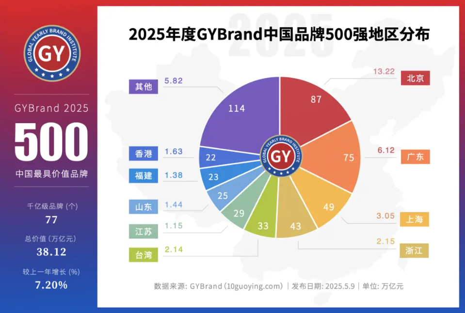 GYBrand近日发布的2025年中国最具价值品牌500榜单显示(查看报告详情>>),今年上榜的500个品牌总价值为38.12万亿人民币,同比增长7.20%,共有77家企业的品牌价值达到千亿级别。前十名单中,北京占据6个,广东占了2个,香港和贵州各占1个,TOP10品牌总价值高达5.47万亿人民币,占了500强品牌总价值的14.35%。