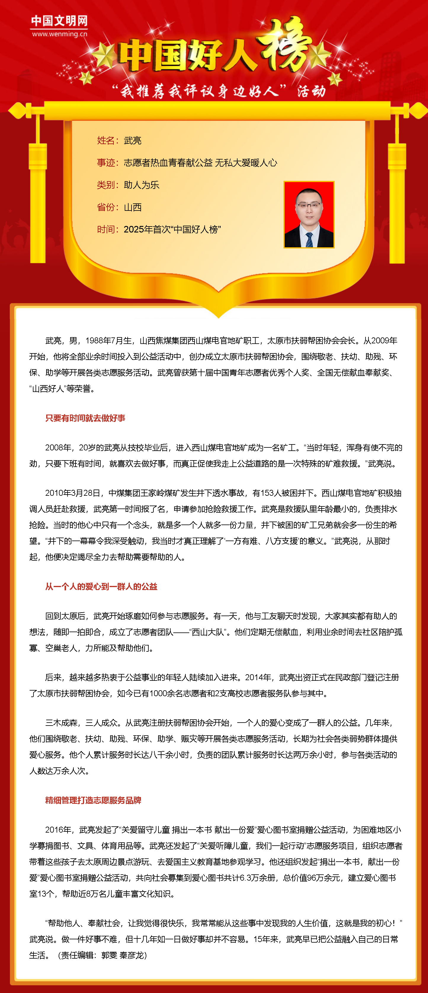 今年37岁的武亮,是山西焦煤集团西山煤电官地矿的一名普通职工,更是太原市扶弱帮困协会的领路人。自2009年起,他将满腔热忱与所有业余时光,毫无保留地倾注于公益事业,躬身力行在敬老、扶幼、助残、环保、助学等多个领域,持续奔走在志愿服务的道路上。16年来,他负责的团队累计服务时长达两万余小时,并通过一次次志愿服务,向需要帮助的人传递希望与力量,以点滴善行照亮他人前行路。