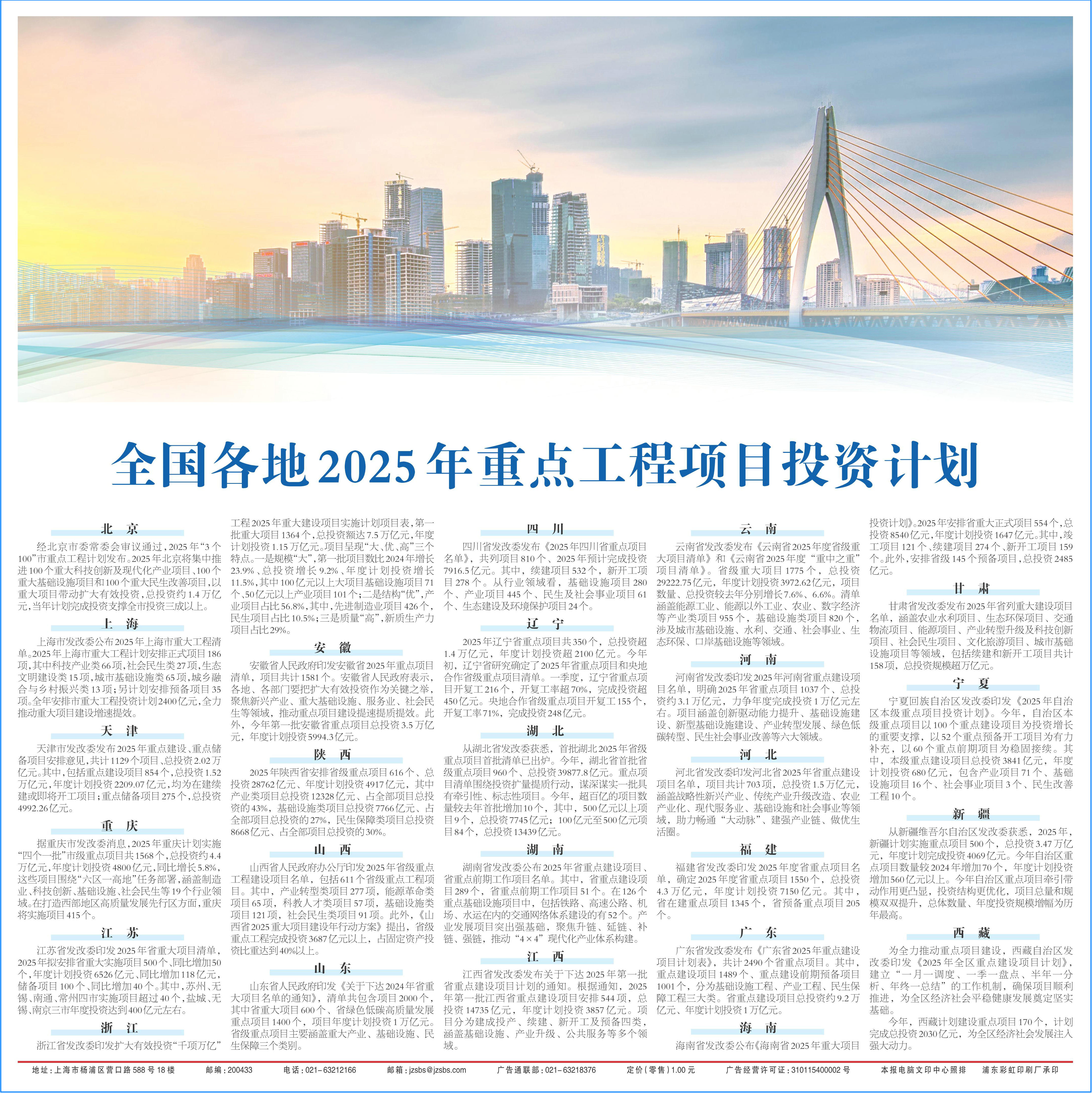 上海市发改委公布2025年上海市重大工程清单。2025年上海市重大工程计划安排正式项目186项,其中科技产业类66项,社会民生类27项,生态文明建设类15项,城市基础设施类65项,城乡融合与乡村振兴类13项;另计划安排预备项目35项。全年安排市重大工程投资计划2400亿元,全力推动重大项目建设增速提效。