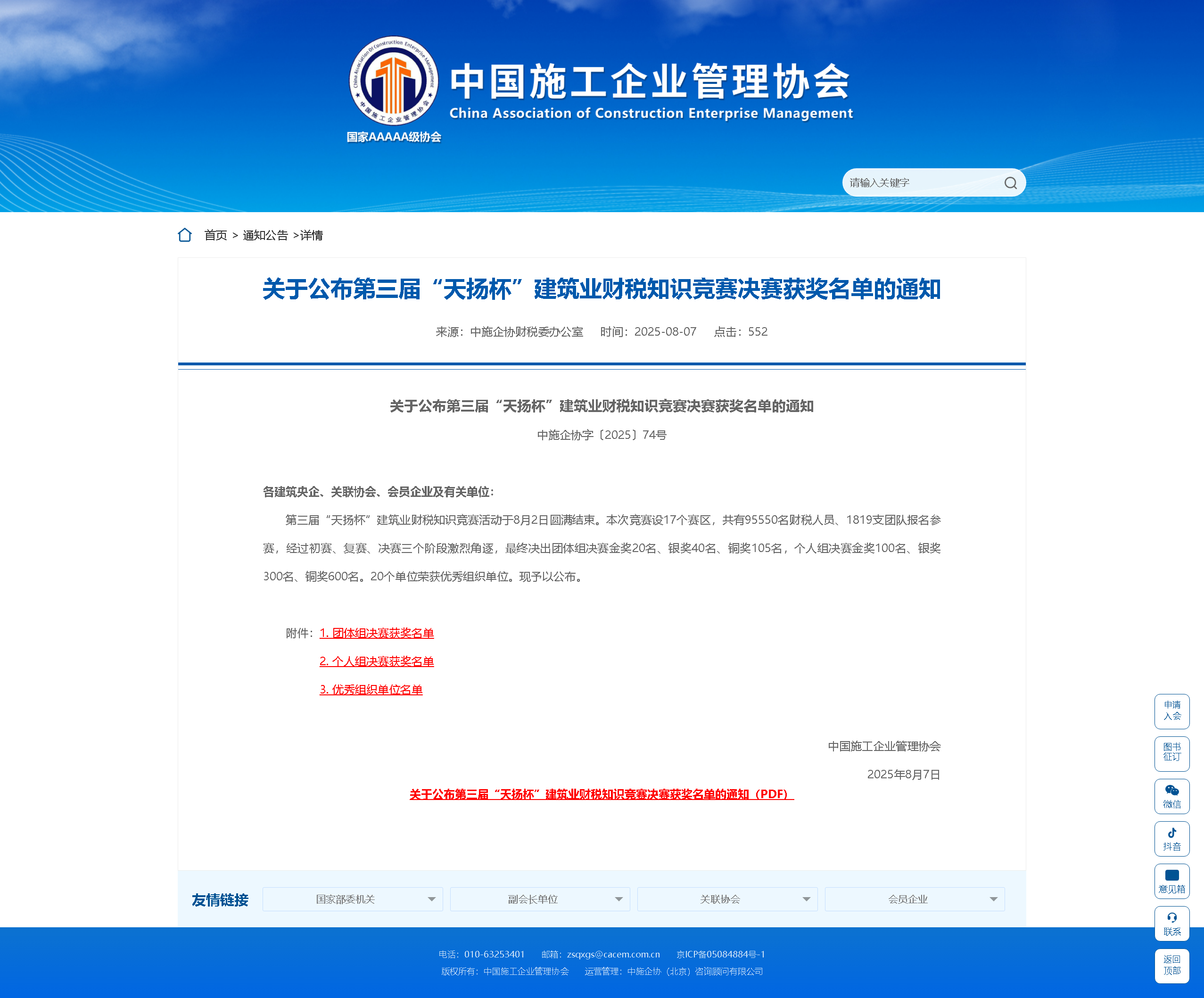 关于公布第三届“天扬杯”建筑业财税知识竞赛决赛获奖名单的通知
