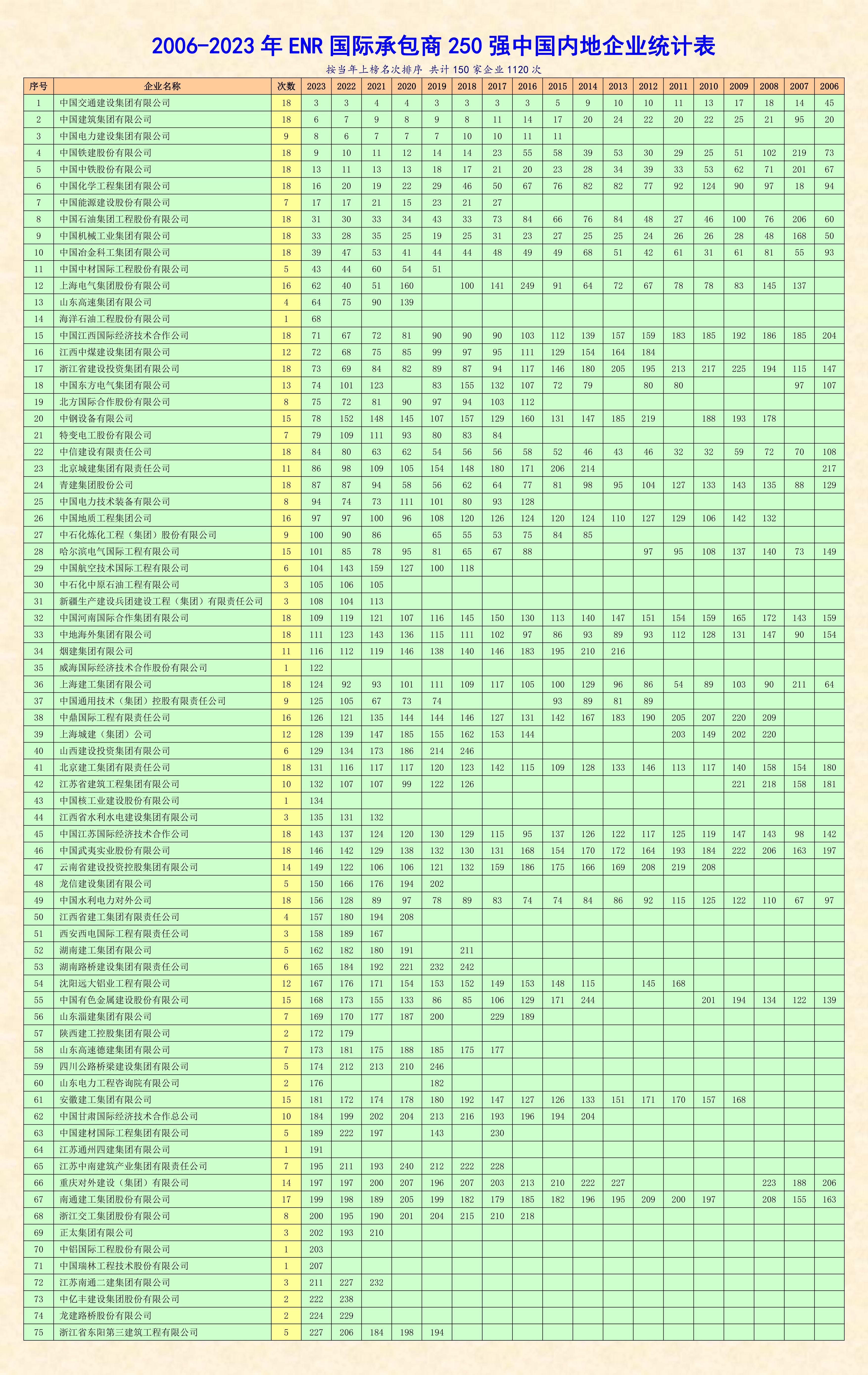 据悉,美国《工程新闻纪录》(ENR)杂志是全球工程建设领域最权威的学术杂志,其每年发布的“全球承包商250强”和“国际承包商250强”榜单被誉为国际工程界的“晴雨表”,是建筑行业公认的、较为全面反映年度全球建筑市场发展状况的权威排名。其中,全球榜单根据企业的整体营业额进行排名,反映了企业的整体营业能力。国际榜单根据企业海外业务营业额,即本国以外的国际市场完成的营业额进行排名,反映了企业在国际市场上的竞争力。