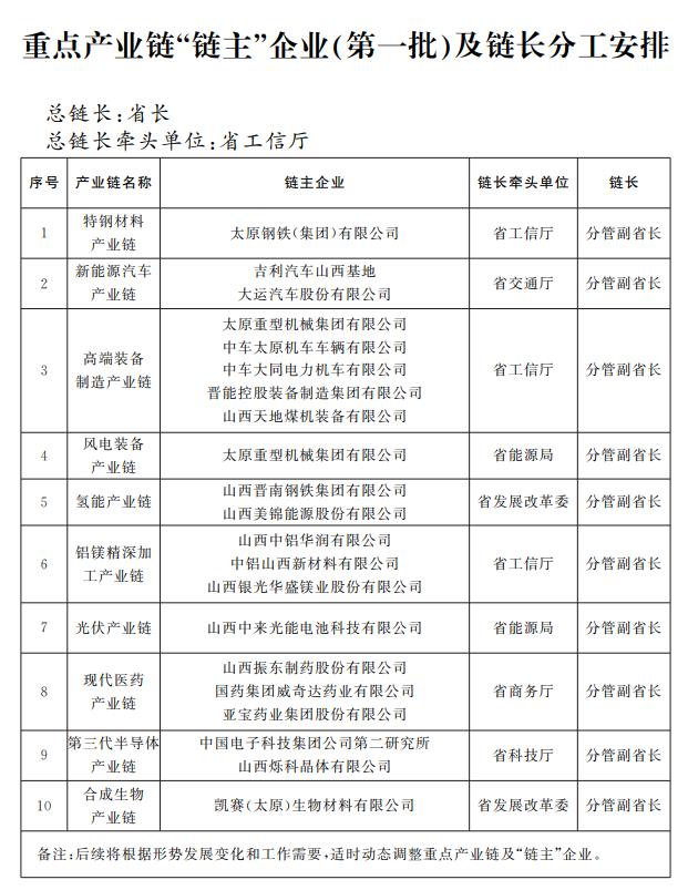 以下为山西资本圈根据两批名单梳理的重点产业链和“链主”企业最新名单: