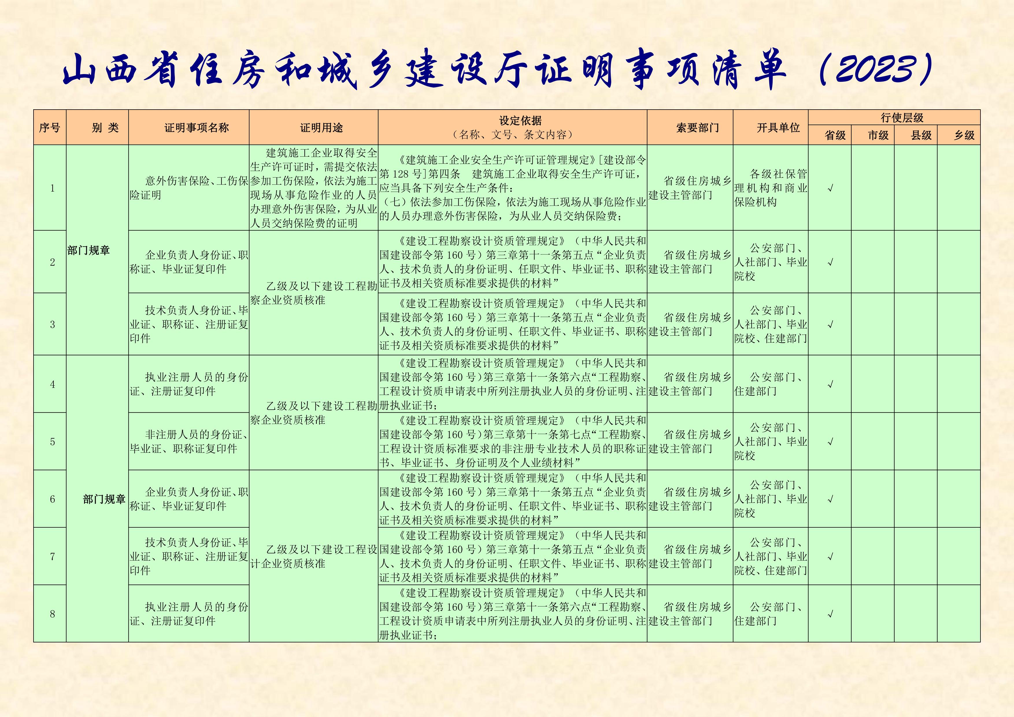 山西省住房和城乡建设厅证明事项清单(2023)