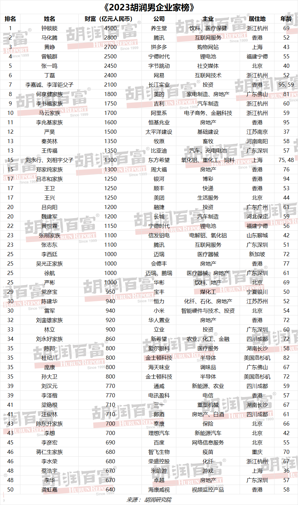 12月12日,胡润研究院发布《2023胡润男企业家榜》,列出了今年胡润百富榜中的前50名男性企业家。这也是胡润研究院首次发布“男企业家榜”。