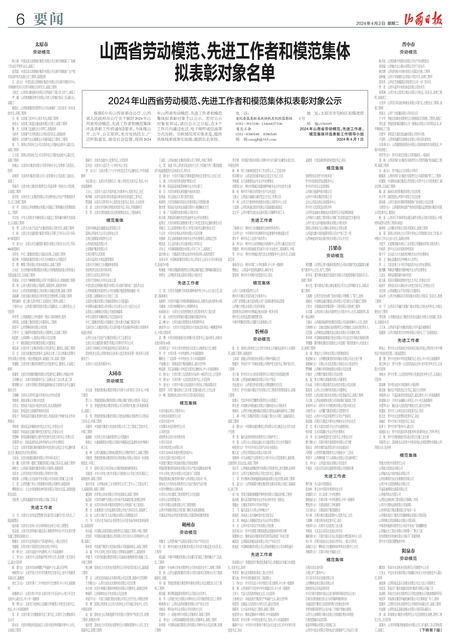 根据《中共山西省委办公厅、山西省人民政府办公厅关于做好2024年山西省劳动模范、先进工作者和模范集体评选表彰工作的通知》要求,为体现公开、公平、公正原则,充分发扬民主、广泛听取意见、接受社会监督,现将2024年山西省劳动模范、先进工作者和模范集体拟表彰对象予以公示。若对公示对象有异议,请自公示之日起,在5个工作日内通过电话、电子邮件或信函等方式反映。反映情况须实事求是,提供具体线索或事实依据,提倡实名举报。