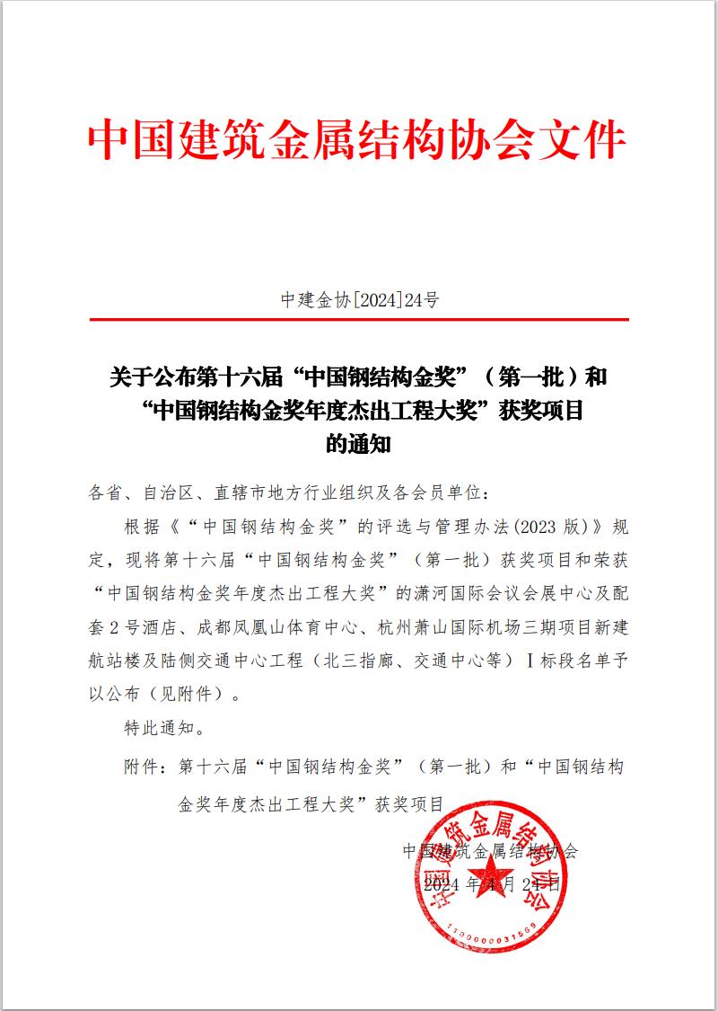 “中国钢结构金奖年度杰出工程大奖”是由住建部委托中国建筑金属结构协会设立的钢结构行业最高工程大奖,是从当年获得“中国钢结构金奖”的项目中优中选优,是钢结构工程领域唯一的国家优质工程奖,代表了我国钢结构行业工程质量的领先水平,获奖的项目对推动钢结构行业工程建设高质量发展有着积极的引领示范作用。