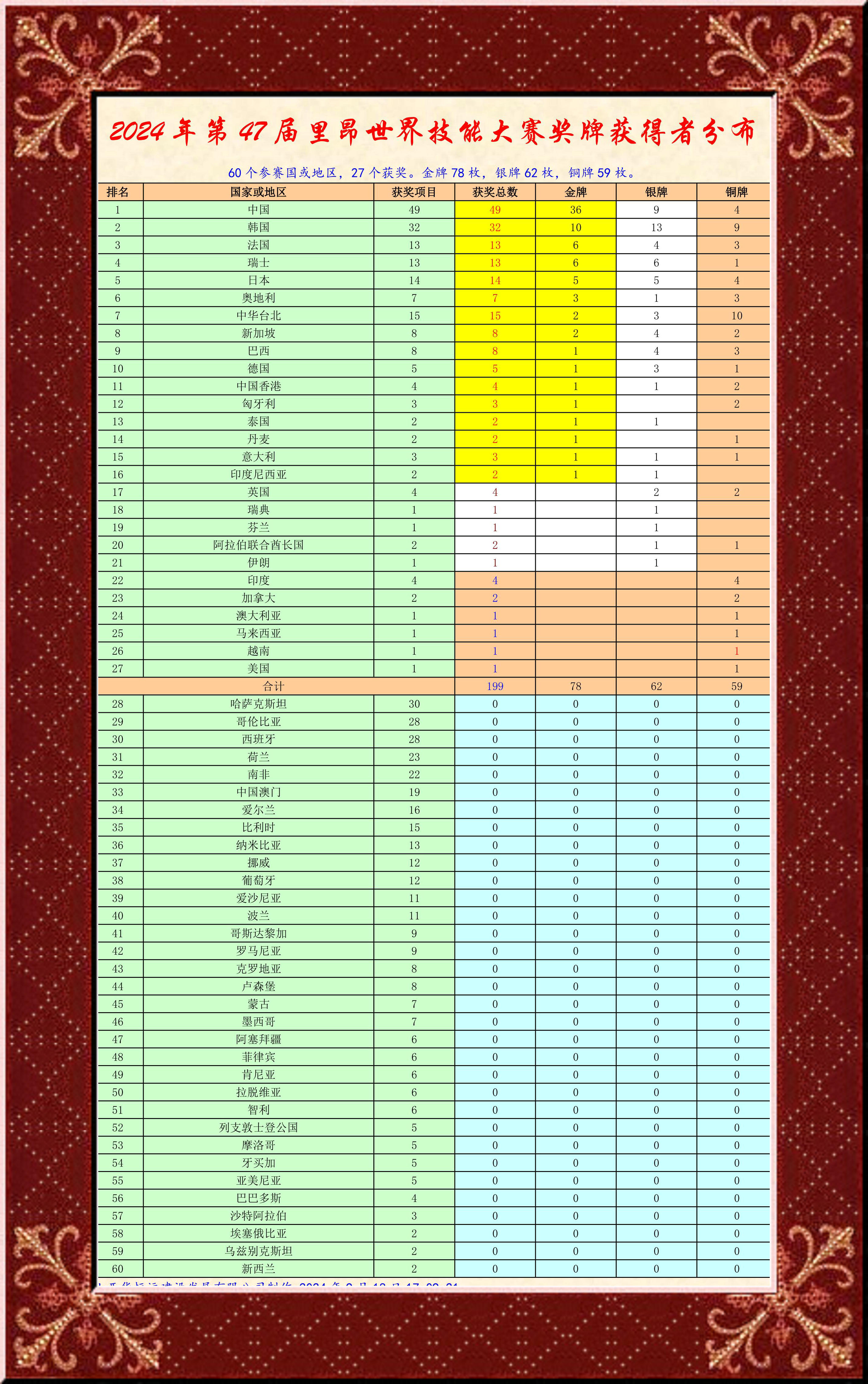 2024第47届世界技能大赛中国代表团奖牌榜