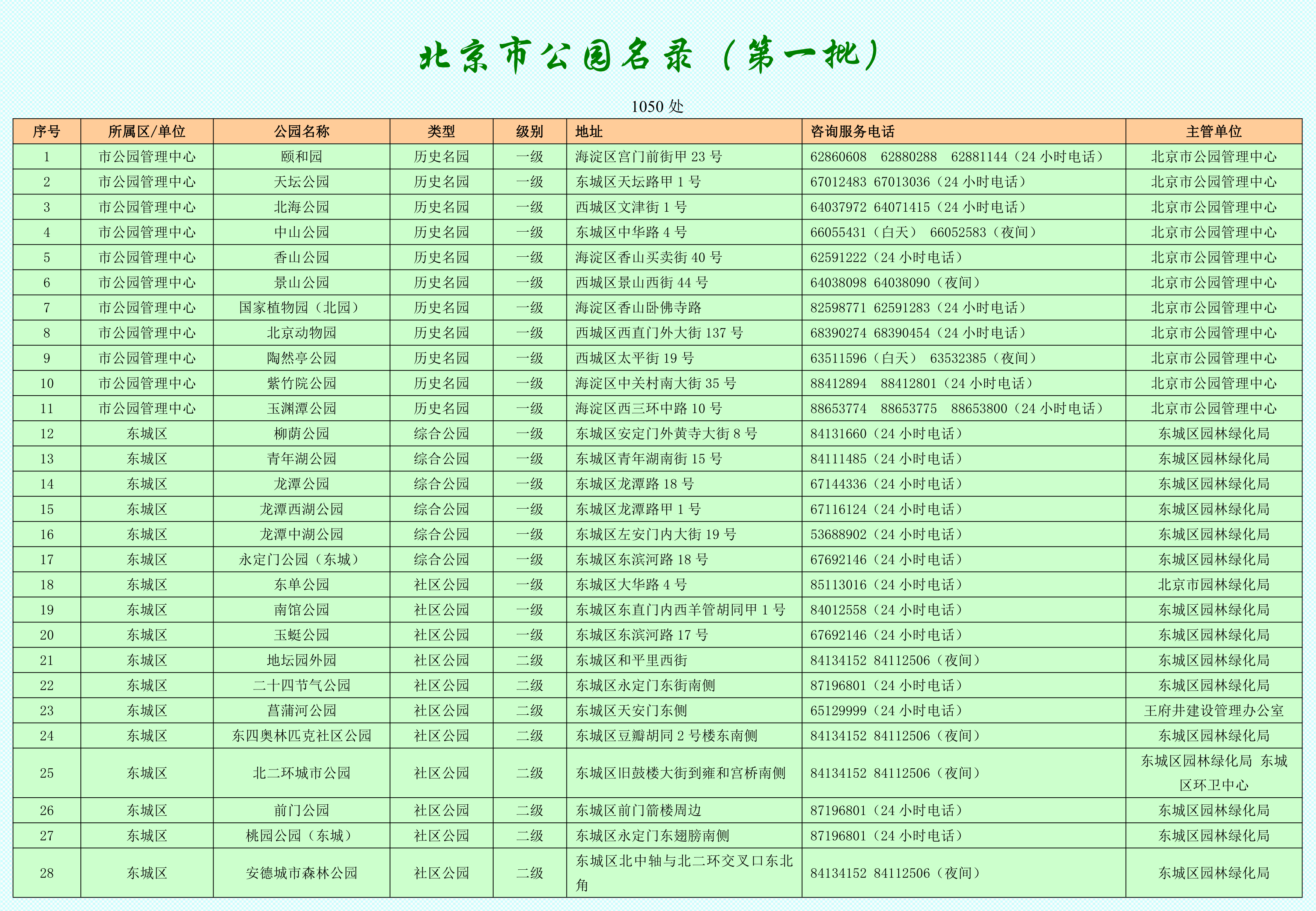 1.颐和园2.天坛公园3.北海公园4.中山公园5.香山公园6.景山公园7.国家植物园(北园)8.北京动物园9.陶然亭公园10.紫竹院公园11.玉渊潭公园12.柳荫公园13.青年湖公园14.龙潭公园15.龙潭西湖公园16.龙潭中湖公园17.永定门公园(东城)18.东单公园19.南馆公园20.玉蜓公园21.地坛园外园22.二十四节气公园23.菖蒲河公园24.东四奥林匹克社区公园25.北二环城市公园26.前门公园27.桃园公园(东城)28.安德城市森林公园29.西革新里城市休闲公园30.燕墩公园31.新中街城市森林公园32.大通滨河公园33.环二环城市绿道社区公园34.环二环城市绿廊社区公园35.玉河公园36.明城墙遗址社区公园37.建国门西北角社区公园38.亮马河公园39.松林里公园40.北京市劳动人民文化宫41.地坛公园42.北京明城墙遗址公园43.皇城根遗址公园44.燕墩遗址游园45.蟠桃宫游园46.广渠秋韵游园47.景泰公园48.清水苑小游园49.安贞桥西南角小游园50.校尉胡同小游园51.四块玉游园52.前门东大街街心花园53.正义路小游园54.朝阳门桥西北侧小游园55.华城公园56.自然博物馆公园57.龙潭东路游园58.左安西里游园59.东直门桥西北侧小游园60.东四十条桥西北侧小游园61.朝阳门桥西南侧小游园62.天安门东南角小游园63.中轴路小游园64.建国门健身乐园65.万国公寓小游园66.灯市口小游园67.农总行小游园68.工体小游园69.同仁小游园70.都市馨园休闲广场71.珠市口东大街休闲广场72.前门东路北部花园73.广渠春晓游园74.领行国际游园75.华城小游园76.四块玉小游园77.天坛西小游园78.祈年大街小游园79.金鱼池小游园80.天坛北路街心花园81.同心园(东城)82.广渠门小游园83.检察院外侧小游园84.坝桥金色小游园85.金中都公园86.永定门公园(西城)87.宣武艺园88.白云公园89.北滨河公园90.双秀公园91.人定湖公园92.万寿公园93.顺城公园94.长椿苑公园95.莲花河城市休闲公园96.北京滨河公园97.翠芳园98.南礼士路公园99.德胜公园100.玫瑰公园101.官园公园102.金融街中心公园103.广宁公园104.德胜苑105.北展后湖社区公园106.小马厂社区公园107.潭西胜境公园108.珠市口西大街社区公园109.逸骏园110.天桥南大街游园111.月坛公园112.什刹海公园113.北京大观园114.西便门城墙遗址公园115.北营房城市森林公园116.新街口城市森林公园117.逸清园城市森林公园118.常乐坊城市森林公园119.广阳谷城市森林公园120.地安门内大街游园121.茶马街游园122.天宁寺休闲游园123.虎坊路游园124.先农坛神仓游园125.手帕口桥南游园126.红山游园127.蓟丘游园128.大红罗游园129.东福寿里游园130.平安里游园131.复兴门桥西北角游园132.白云观游园133.都城隍庙游园134.人定湖北巷游园135.教场口街游园136.西章胡同游园137.东光胡同游园138.西直门内大街游园139.建成园140.五栋大楼游园141.车公庄大街游园142.龙头井游园143.北大医院游园144.广顺苑145.白纸坊西街游园146.右安闻莺游园147.教子胡同游园148.天宁塔影游园149.广外湾子路口游园150.京韵园151.棉花片游园152.蜡烛园153.月亮湾公园154.百花园155.和平门游园156.南线阁街游园157.复兴门游园158.南新华街游园159.牛街游园160.二里沟游园161.东官房游园162.南堂游园163.南礼士路游园164.黄寺大街游园165.白广路游园166.右内大街游园167.先农坛西路游园168.青年游园169.沈家本故居游园170.景山游园171.奥林匹克森林公园172.朝阳公园173.庆丰公园174.大望京公园175.团结湖公园176.朝阳区红领巾公园177.四得公园178.北小河公园179.望和公园180.兴隆公园181.古塔公园182.将府郊野公园(一至三期)183.将府公园(四期)184.温榆河公园(朝阳)185.望湖公园186.立水桥公园187.东一处公园188.润泽公园189.万和桐城公园190.望承公园191.太阳宫花园192.仰山公园193.儿童主题公园194.华汇紫薇公园195.瑞竹园196.百子湾公园197.望京SOHO和趣园198.十友园199.丽都公园200.金隅南湖公园201.望京体育公园202.弘善城市休闲公园203.常营保利公园204.翠城公园205.坝河休闲公园206.暖山生态公园207.日坛公园208.元大都城垣(土城)遗址公园(朝阳段)209.京城森林郊野公园210.小武基公园211.朝来森林公园(三期)212.官庄公园213.东风公园214.鸿博郊野公园215.镇海寺郊野公园216.勇士营郊野公园217.京城槐园郊野公园218.平房公园219.白鹿郊野公园220.京城梨园郊野公园221.东坝郊野公园222.常营公园223.朝来森林公园224.金田郊野公园225.太阳宫公园226.老君堂郊野公园227.海棠郊野公园228.清河营郊野公园229.黄草湾郊野公园230.杜仲公园231.京城体育郊野公园232.百花郊野公园233.太阳宫体育休闲公园234.八里桥公园235.华茂绿线休闲园236.大屯阳光休闲园237.昆泰休闲公园238.小红门芳林园239.会议中心休闲园240.家乐福休闲园241.劲松百环休闲园242.利星行休闲园243.绿影园244.丁香园245.裘马都休闲园246.左家庄科普廉政文化园247.首城国际休闲园248.小关奥林匹克文化游园249.紫檀休闲园250.百花深处小游园251.何里栖地公园252.四合公园253.孙河郊野公园254.马家湾湿地公园255.西小口公园256.玲珑公园257.荷清园公园258.马甸公园259.北坞公园260.百旺公园261.温泉公园262.海淀公园263.巴沟山水园264.长春健身园265.王庄公园266.定慧公园267.五棵松奥林匹克文化公园268.幸福花园269.厢黄旗公园270.同泽秋园271.会城门公园272.北极寺公园273.中央电视塔公园274.小营公园275.燕清文化体育公园276.美和园公园277.同泽春园278.阳光星期八公园279.南长河公园280.车道沟公园