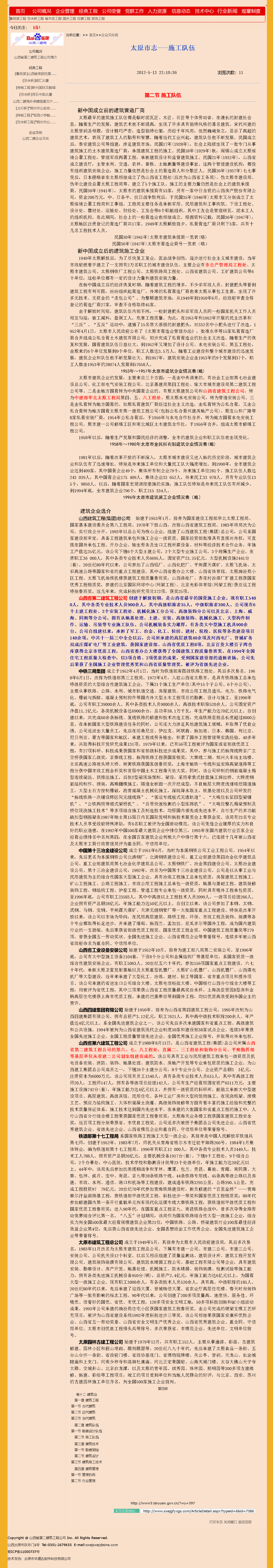 太原最早的建筑施工队伍都是临时泥瓦匠、木匠、石匠等个体劳动者。在漫长的封建社会里,随着生产的发展,建筑艺术也不断提高,出现了许多具有独特风格的著名建筑。宋代兴建的太原晋祠圣母殿,设计精巧严密,造型独特壮丽,历经千年风雨,依然巍峨耸立,显示了高超的建筑艺术,表现了建筑工人的勤劳和智慧。随着近代工业兴起,建筑队伍也不断发展。民国成立后,泰安建筑公司等组建,涉足建筑市场。民国17年(1928年),社会上陆续出现了一批专门从事建筑施工的土木建筑营造厂商,承揽建筑工程的施工。民国18年(1929年)秋,阎锡山成立太原绥靖公署工程处,管理军政两署工程,承担建筑设计和监督建筑施工。民国21年(1932年),山西省成立建设厅,主管水利、交通、农林、畜牧、土地测量等建设事宜。这两个管理建设机构,都没有组织建筑安装企业,施工力量依然是社会上的营造商人和分散匠人。民国26年(1937年)七七事变后,日本侵略者在太原相继成立了伪山西省工程处(后改为山西省工务局)、伪太原市建设局、伪华北建设总署太原工程局等。建立了5个施工队。施工的主要力量仍然是社会上的建筑承揽商。民国30年(1941年),太原市的建筑承揽商有53家,另有一家中日合资的山西房产股份有限公司,资金200万元,中、日各半。抗日战争胜利后,于民国35年(1946年)太原市又分别成立了太原绥靖公署工程局和工事组。工程局主要任务是承担军用、民用建筑和工事构筑。下设工程处、设计处、器材处、运输处、财经处、工友会等6个职能组织。其中工友会是管理砖瓦、泥水工人的组织机构。在此期间,社会上的一些营造业也相继成立。根据资料记载,民国36年(1947年),太原地区注册登记的营造厂商共17家。1949年太原解放前夕,私营营造厂商只剩下3家,共有十几名工程技术人员。