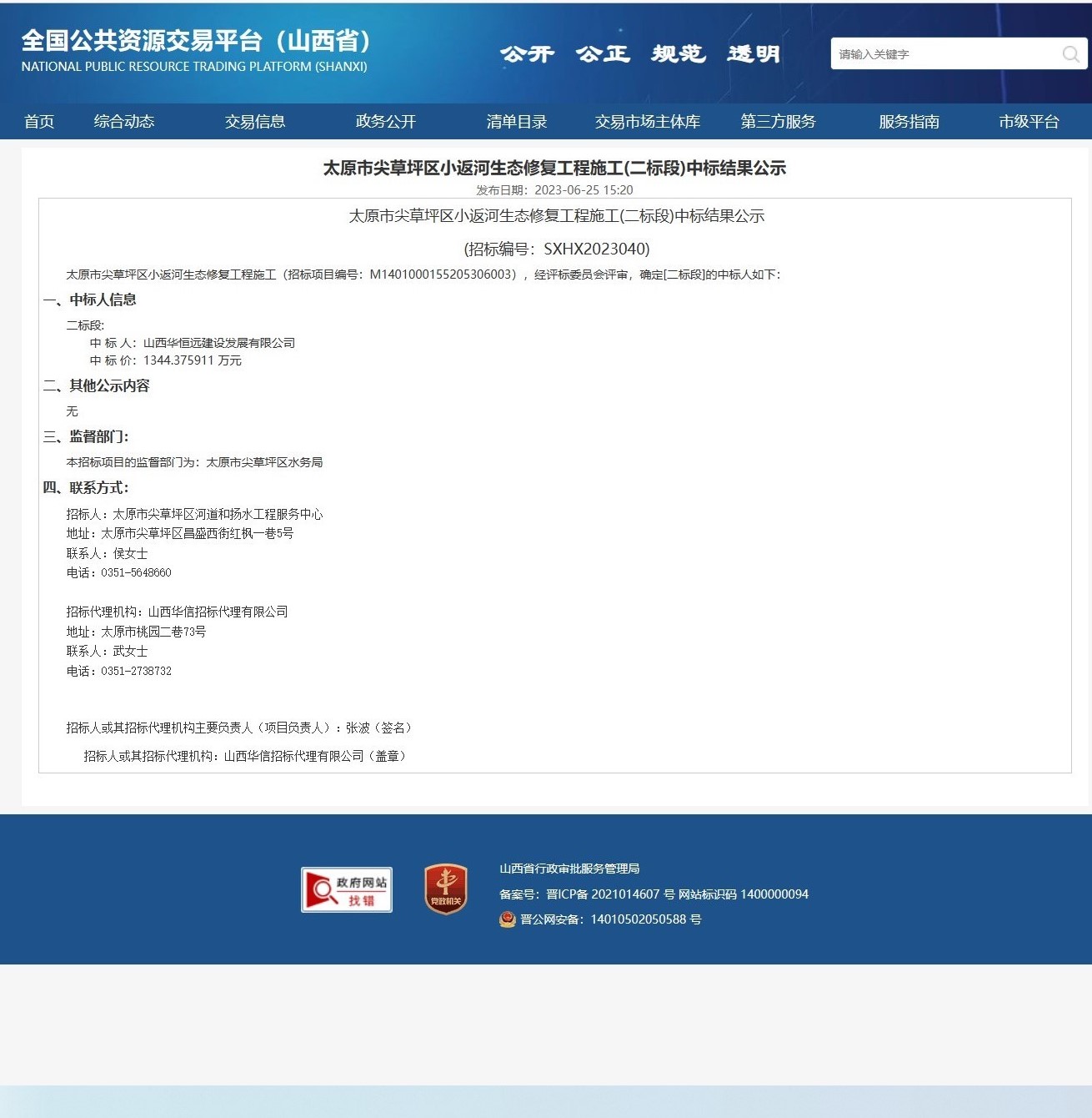 小返河生态修复工程施工(二标段)中标1344.37万元