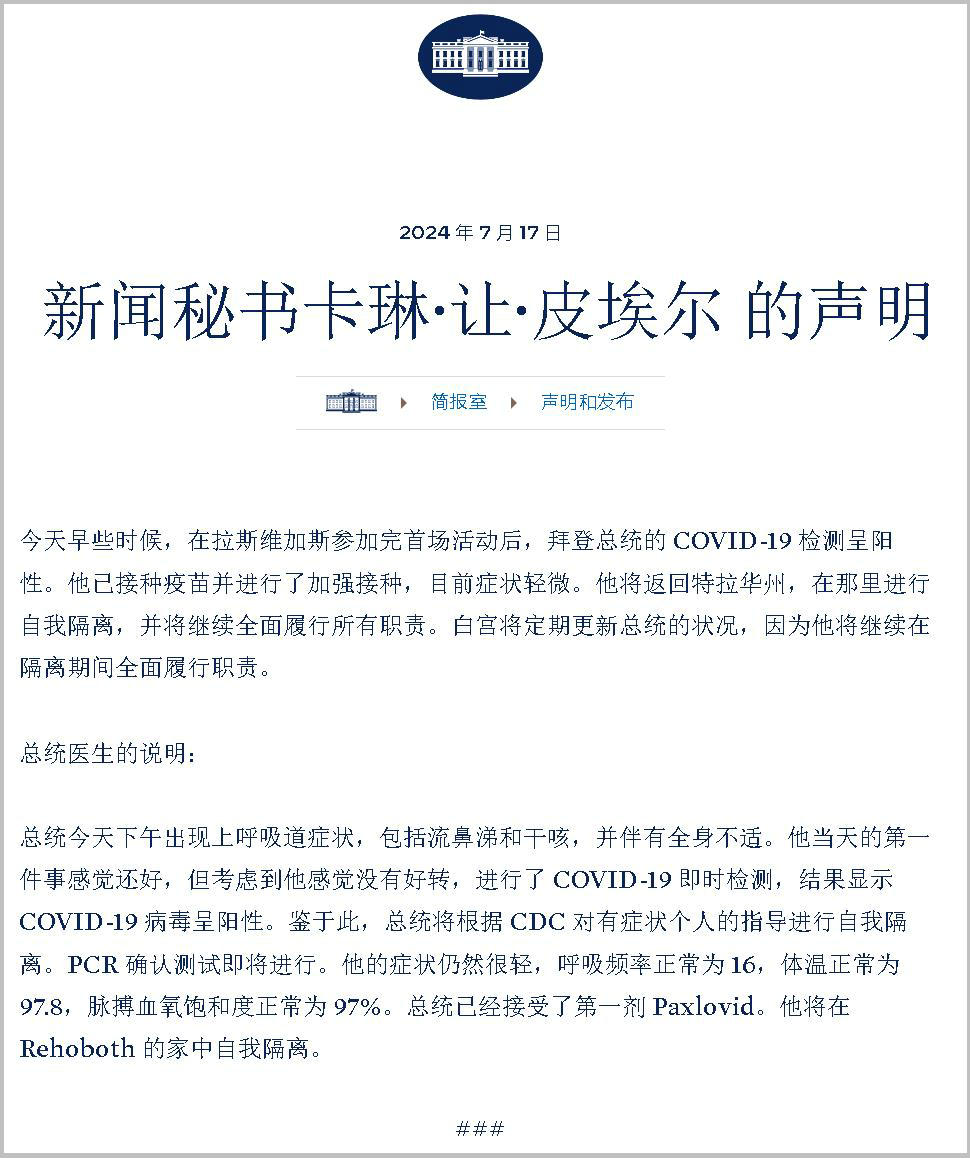 声明表示,拜登17日早些时候在拉斯维加斯参加完活动后接受新冠病毒检测,结果呈阳性。拜登此前接种过疫苗并打了加强针,他将在特拉华州的家中自我隔离,并继续履职。