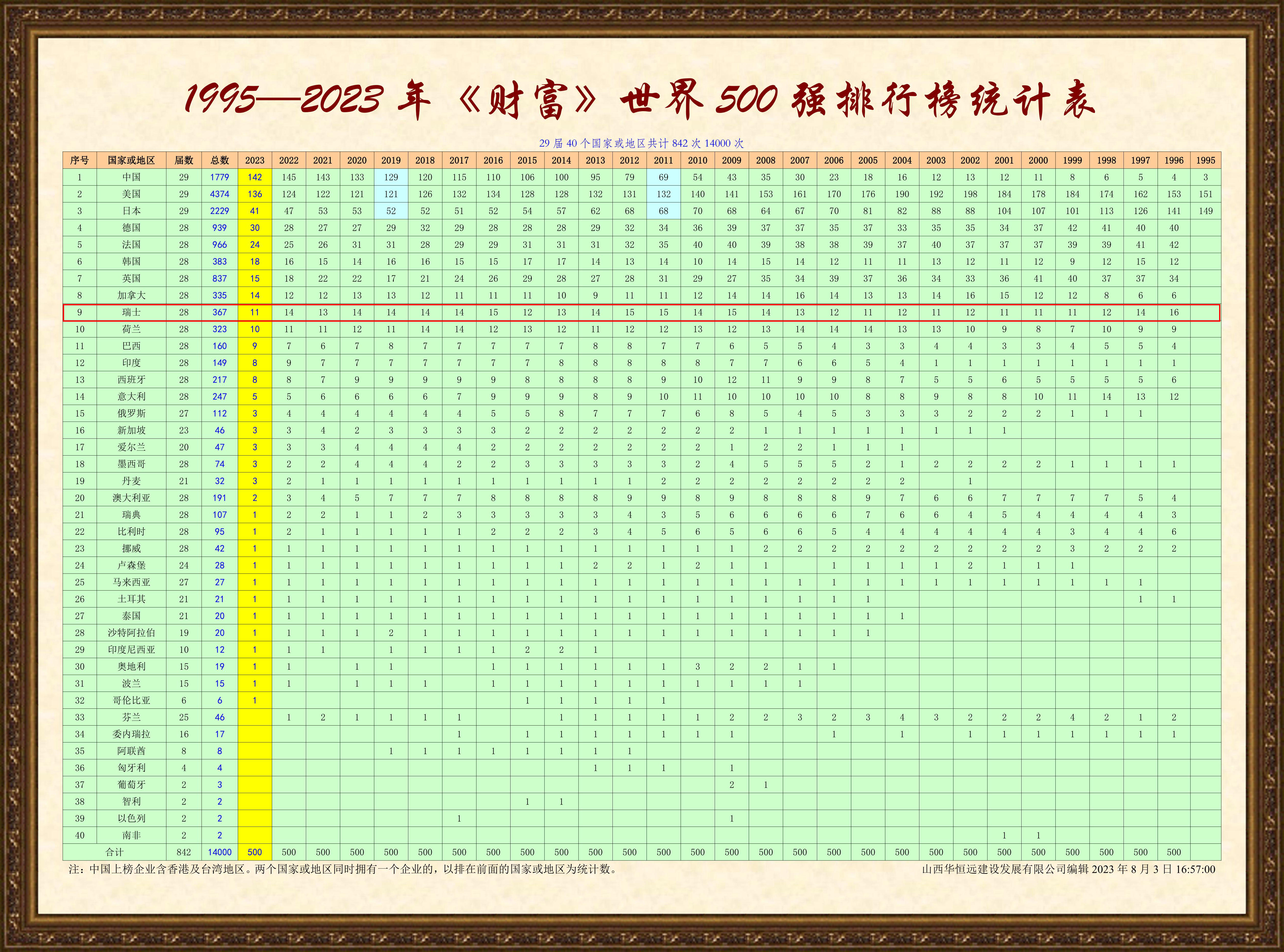 2020年,瑞士的GDP总量高达7500亿美元,介于我国的福建和四川之间,在我国的各省和直辖市中能够排到第7。瑞士如今也是世界20大经济体之一,GDP比土耳其和沙特还要高。2020年,世界企业500强榜单中,瑞士的企业超过14家。瑞士的世界500强企业和韩国数量相同,并列世界第7。