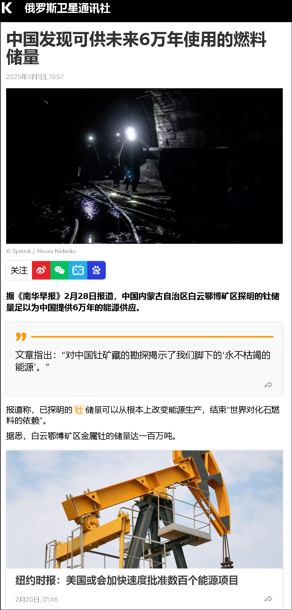 文章指出:“对中国钍矿藏的勘探揭示了我们脚下的‘永不枯竭的能源’。”