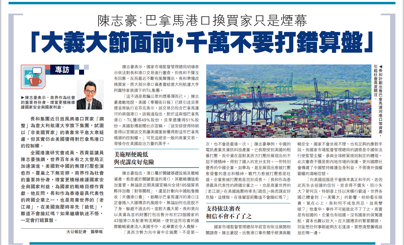 「这不过是欺骗公众的烟幕弹而已。」陈志豪激动地说,美国《华尔街日报》已经引述贝莱德首席执行官芬克表示,该交易仍包含巴拿马运河的两个港口。该报道指出,对于这两个巴拿马港口,TiL获得49%股份,贝莱德获得51%股份。美国彭博新闻社亦宣称,「该安排使得特朗普得以宣扬该交易让美国重新获得对这些巴拿马码头的控制权。」可见这绝非一般的商业交易,背后存在美国政治力量的黑手。