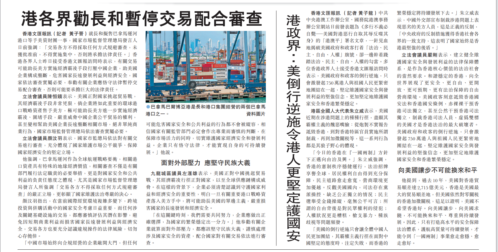 香港文汇报讯(记者黄子晋)就长和拟售巴拿马运河港口等予美资财团一事,国家市场监督管理总局发言人日前强调:「交易各方不得采取任何方式规避审查,未获批准前,不得实施集中,否则将承担法律责任。」香港各界人士昨日接受香港文汇报访问时表示,有关交易可能助长美方实施经济霸凌手段打压中国企业,助美国企业构成垄断,危害国家长远发展利益与经济安全,国家依法审查实属必要,奉劝有关企业应恪守法律暂停交易配合审查,否则可能要承担巨大的法律责任。