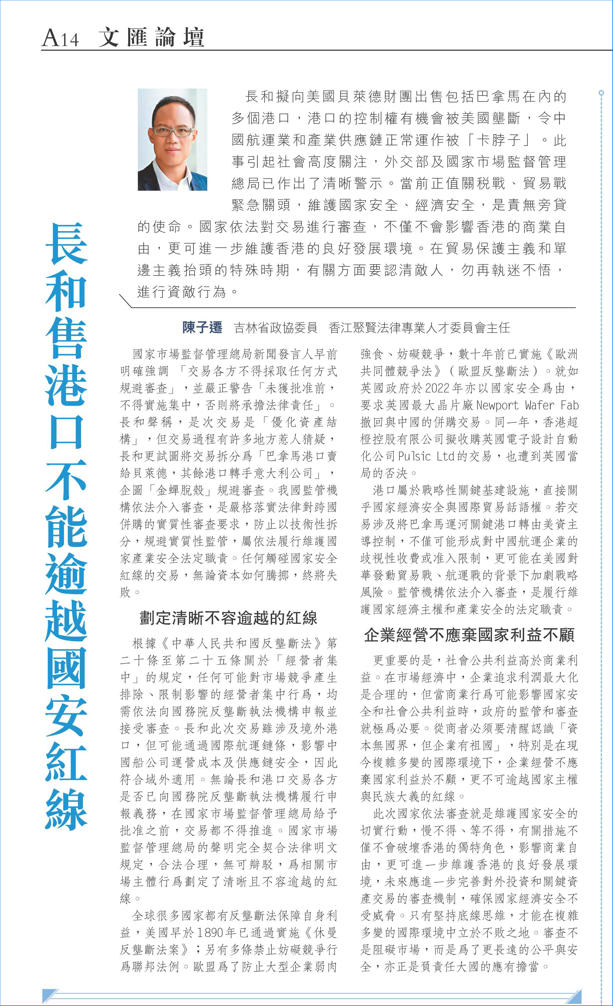 长和拟向美国贝莱德财团出售包括巴拿马在内的多个港口,港口的控制权有机会被美国垄断,令中国航运业和产业供应链正常运作被「卡脖子」。此事引起社会高度关注,外交部及国家市场监督管理总局已作出了清晰警示。当前正值关税战、贸易战紧急关头,维护国家安全、经济安全,是责无旁贷的使命。国家依法对交易进行审查,不仅不会影响香港的商业自由,更可进一步维护香港的良好发展环境。在贸易保护主义和单边主义抬头的特殊时期,有关方面要认清敌人,勿再执迷不悟,进行资敌行为。