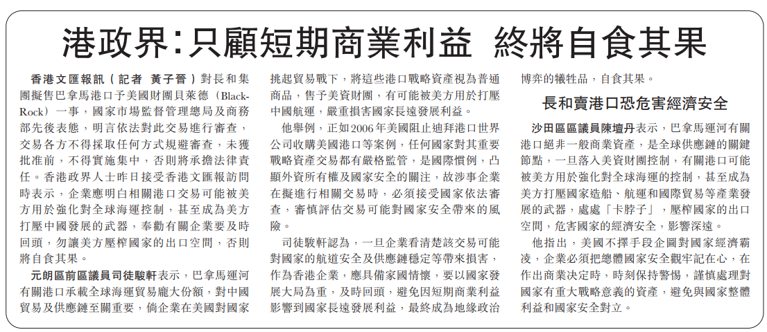香港文汇报讯(记者黄子晋)对长和集团拟售巴拿马港口予美国财团贝莱德(BlackRock)一事,国家市场监督管理总局及商务部先后表态,明言依法对此交易进行审查,交易各方不得采取任何方式规避审查,未获批准前,不得实施集中,否则将承担法律责任。香港政界人士昨日接受香港文汇报访问时表示,企业应明白相关港口交易可能被美方用于强化对全球海运控制,甚至成为美方打压中国发展的武器,奉劝有关企业要及时回头,勿让美方压榨国家的出口空间,否则将自食其果。