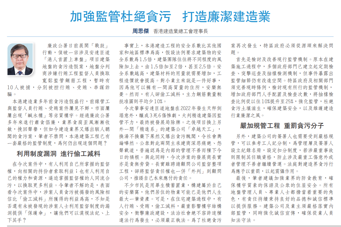 本港建造业多年前贪污造假盛行,前线管工与监督人员行贿、受贿案件屡见不鲜,市面屡屡出现「咸水楼」等劣质楼宇。经过廉政公署多年来进行肃贪倡廉,业界贪腐歪风渐渐收敛,挽回声誉,但如今建造业界又爆出骇人听闻的贪污案,笔者不禁问,本港建筑工程已有一套严格的监管制度,为何仍出现这个问题?
