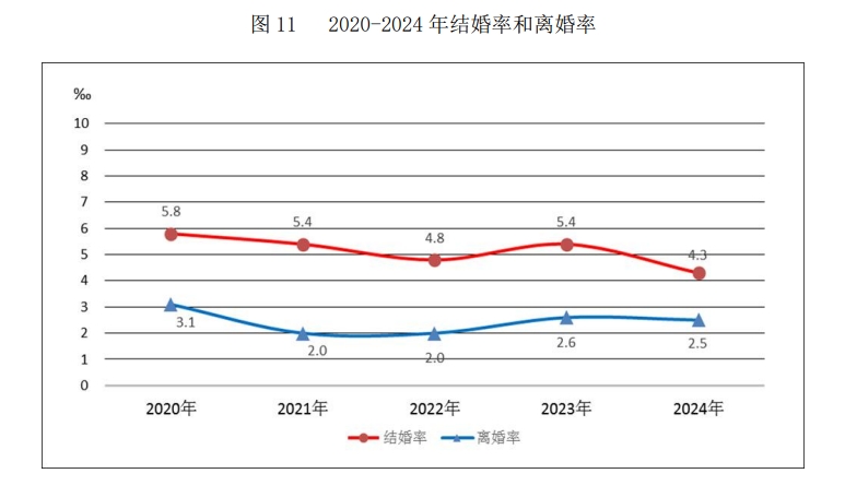 《公报》数据显示,2024年,全国婚姻登记机构和场所共计4190个,其中婚姻登记机构1134个,全年依法办理结婚登记610.6万对,比上年下降20.5%。结婚率为4.3‰,比上年下降1.1个千分点。依法办理离婚手续351.3万对,其中:民政部门登记离婚262.2万对,法院判决、调解离婚89.1万对。离婚率为2.5‰。