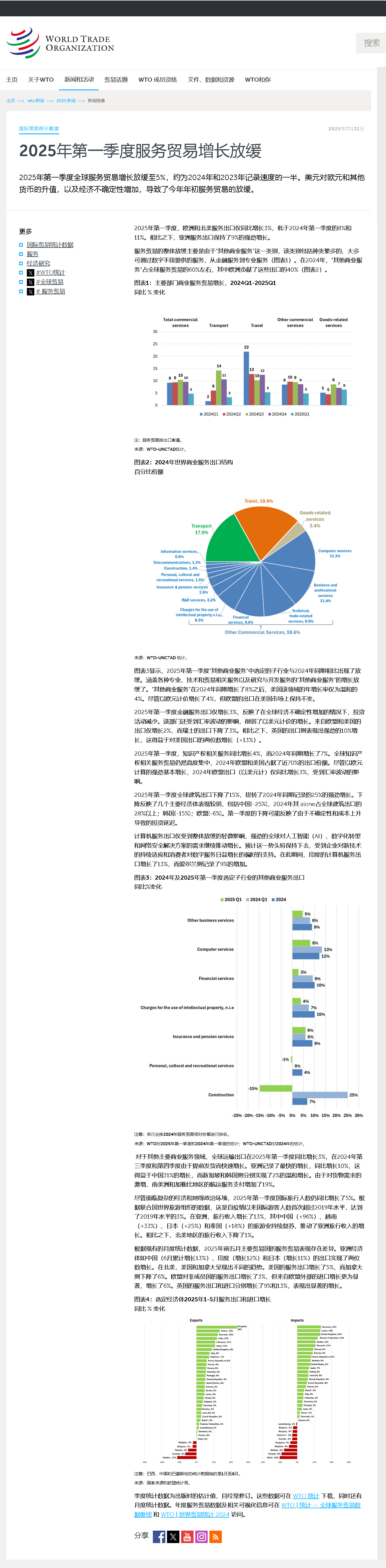 当地时间7月31日,世贸组织发布最新数据显示,2025年第一季度,全球服务贸易增速放缓至同比增长5%,约为2024年和2023年增速的一半。