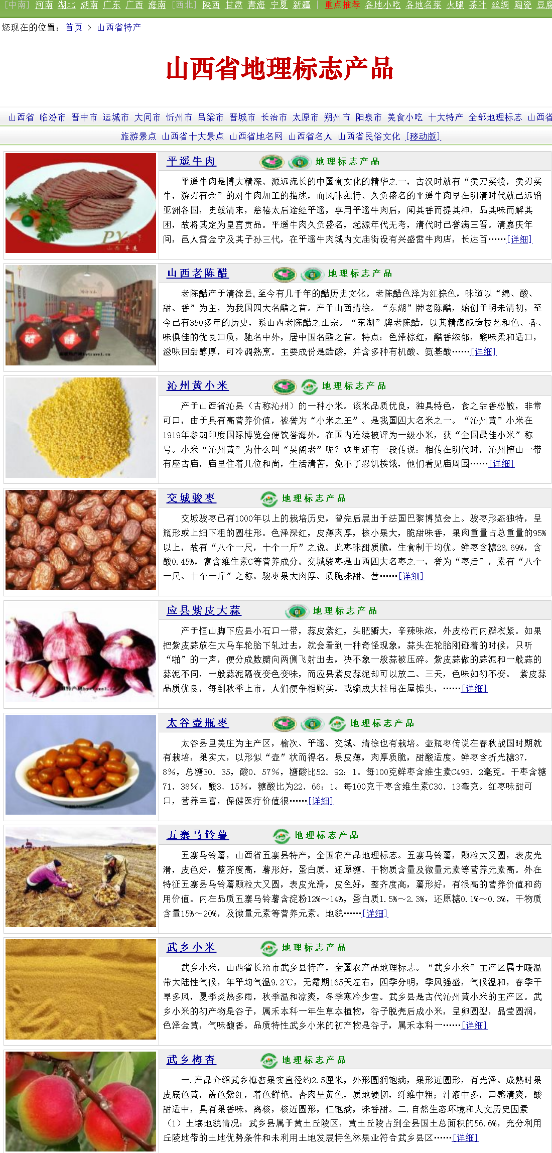 *平遥牛肉 * 山西老陈醋 * 沁州黄小米 * 交城骏枣 * 应县紫皮大蒜 * 太谷壶瓶枣 * 五寨马铃薯 * 武乡小米* 武乡梅杏 * 代县大米 * 大宁西瓜 * 王过酥梨 * 寿阳豆腐干 * 澄泥砚 * 平定黄瓜干 *灵丘荞麦 * 上党党参 * 柳林大红枣 * 太谷饼 * 古县核桃 * 祁县酥梨 * 大同黄花 * 晋祠大米* 襄垣手工挂面 * 万荣苹果 * 沁水黄小米 * 黎城核桃 * 灵石荆条蜂蜜 * 平遥推光漆器 * 孝义柿子 *左权绵核桃 * 阳城山茱萸 * 芮城屯屯枣 * 平遥长山药 * 清徐葡萄 * 灵境莜麦 * 兴县小米 * 运城苹果* 冀村长山药 * 芮城菊花 * 平遥酥梨 * 贺家庄鲜桃 * 榆次苹果 * 上党高粱 * 平顺花椒 *平定冠山连翘茶 * 兴县大明绿豆 * 五寨红芸豆 * 阳城花椒 * 泽州黄小米 * 涑川茼蒿 * 右卫土豆 * 东赵小白梨* 和顺肉牛 * 神池胡油 * 忻州香瓜 * 阳城蚕茧 * 怀仁羔羊肉 * 大同小明绿豆 * 沁州核桃 *义井甜瓜 * 永济大樱桃 * 河峪小米 * 右玉羊肉 * 榆社洋槐蜜 * 芮城花椒 * 长子大青椒 * 西回小米* 大宁河鸡 * 怀仁陶瓷 * 梧桐山药 * 隆化小米 * 沁州南瓜子 * 隰县梨 * 恒山黄芪 *泽州红山楂 * 寿阳小米 * 长凝大蒜 * 汾州核桃 * 稷山板枣 * 官滩枣 * 平鲁红山荞麦 * 永济芦笋* 万荣大黄牛 * 洪洞莲藕 * 熬脑大葱 * 绛县山楂 * 壶关党参 * 榆社笨鸡蛋 * 襄陵莲藕 *孝义核桃 * 左云苦荞 * 广灵大尾羊 * 广灵小米 * 乡宁翅果 * 洪井三皇小米 * 岚县马铃薯 * 长治堆锦* 沁水黑木耳 * 柏籽羊肉 * 清徐老陈醋 * 临县红枣 * 万泉大葱 * 临猗苹果 * 阳高长城羊肉 *平定荆花蜂蜜 * 潞州黄芩 * 上党连翘 * 闻喜宰相花馍 * 代县酥梨 * 芮城芦笋 * 闻喜莲藕 * 绛县大樱桃* 连伯韭菜 * 泗交黑木耳 * 仙人红薯 * 神池黑豆 * 神池黍子 * 沁水黑山羊 * 巴公大葱 *神池胡麻 * 应县陶瓷 * 汾西梨 * 灵丘大青背山羊 * 原平紫皮大蒜 * 隰县玉露香梨 * 平定砂器 * 晋城荆条花蜂蜜* 曲沃麦茬羊肉 * 广灵苦荞 * 广灵大尾羊羊肉 * 北董大蒜 * 清徐沙金红杏 * 霍州核桃 * 沁水刺槐蜂蜜 *平陆苹果 * 天镇唐杏 * 应县胡萝卜 * 偏关羊肉 * 偏关小米 * 涔山芥菜 * 宁武莜麦 * 神池羊肉* 定襄甜瓜 * 霍州苹果 * 斗山杏仁 * 析城山小米 * 汾阳酿酒高粱 * 吉县苹果 * 应县青椒 *永和条枣 * 岢岚红芸豆 * 大宁红皮小米 * 繁峙黄米 * 高平大黄梨 * 神池莜麦 * 北景柿子 * 芮城苹果* 临晋江石榴 * 南林交莲藕 * 阳曲小米 * 蒲县核桃 * 平顺潞党参 * 陵川黑山羊 * 孙家湾香椿 *赵康辣椒 * 杜马百合 * 阳城桑葚 * 安泽连翘 * 戎子酒庄葡萄酒 * 交城梨枣 * 壶关旱地西红柿 * 万荣三白瓜* 运城盐池黑泥 * 蒲县马铃薯 * 广灵画眉驴 * 七里坡山楂 * 岢岚柏籽羊肉 * 忻州糯玉米 * 临县开阳大枣 *吴王渡黄河鳖 * 运城盐池大盐 * 杏花村酒 * 竹叶青酒 *