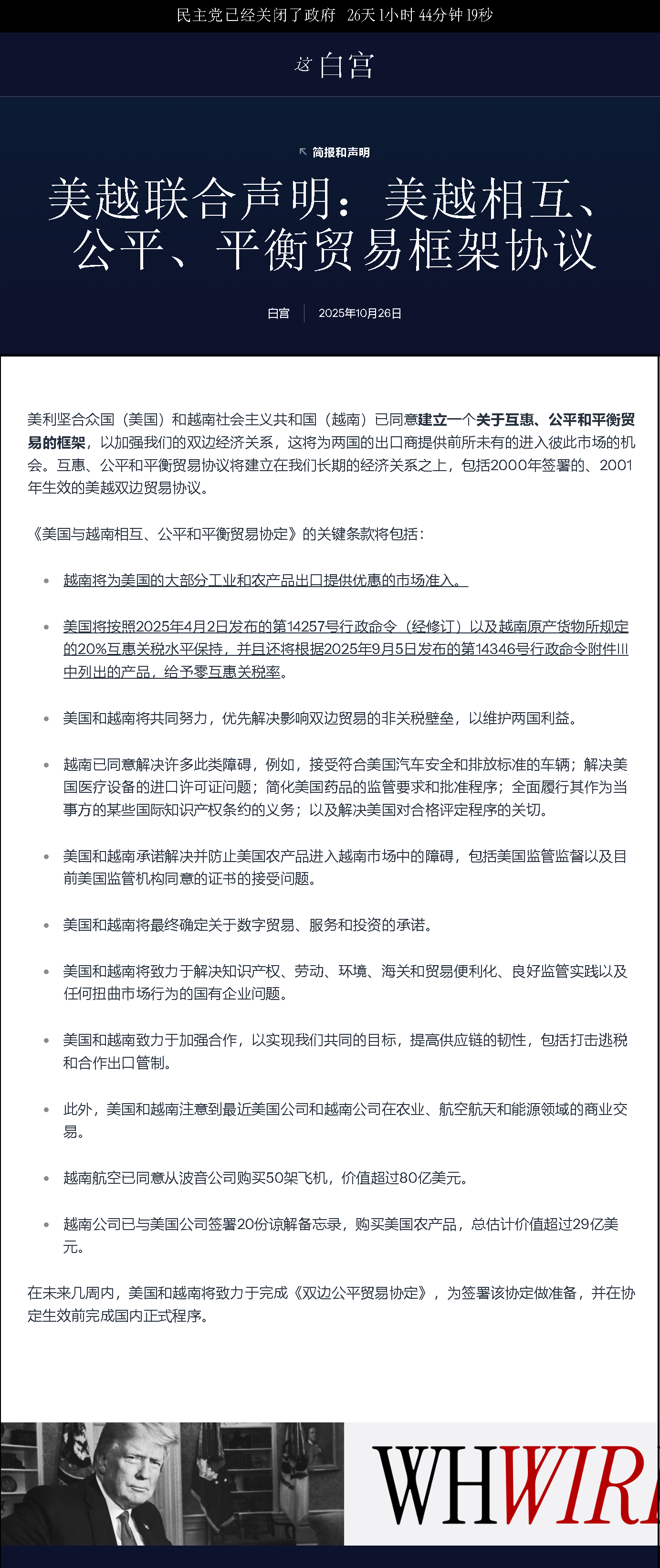 在中美两国正在进行经贸谈判之际,越南的突然出手引发了各方关注。10月26日,越南与美国联合发表声明,宣布达成了一项重要的经贸协议框架,其中涉及对中国及其他国家的转口贸易问题。这一举动的背后,究竟隐藏着怎样的战略意图?