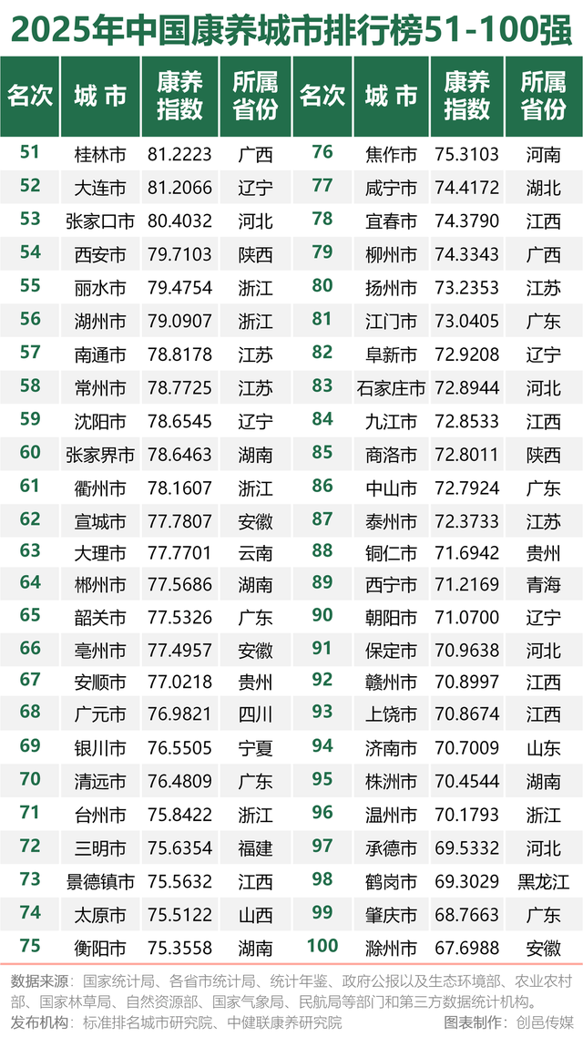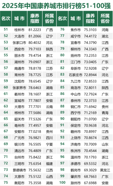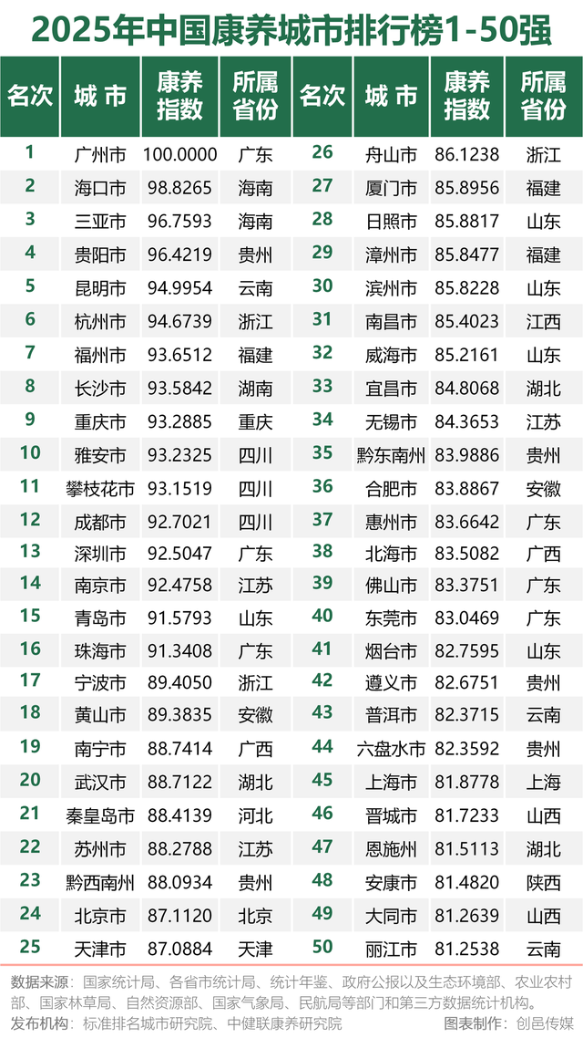 2025年中国康养城市排行榜前50强,广东6城市上榜,包含榜首