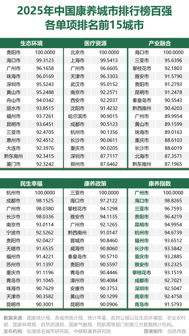 康养城市指标体系共设五大一级指标,分别为生态环境、医疗资源、产业融合、民生幸福、康养政策,由中国科学院、国家林业和草原局、中国老龄科学研究中心、北京林业大学等单位的专家参与研究编制。榜单数据来源主要是国家统计局、各部委、各地方政府统计公报以及中国城市统计年鉴等权威数据,以康养城市指标体系为基础,结合最新的权威数据,由标准排名城市研究院、中健联康养研究院等研究机构进行数据分析,得出年度康养城市排名,可谓含金量十足。