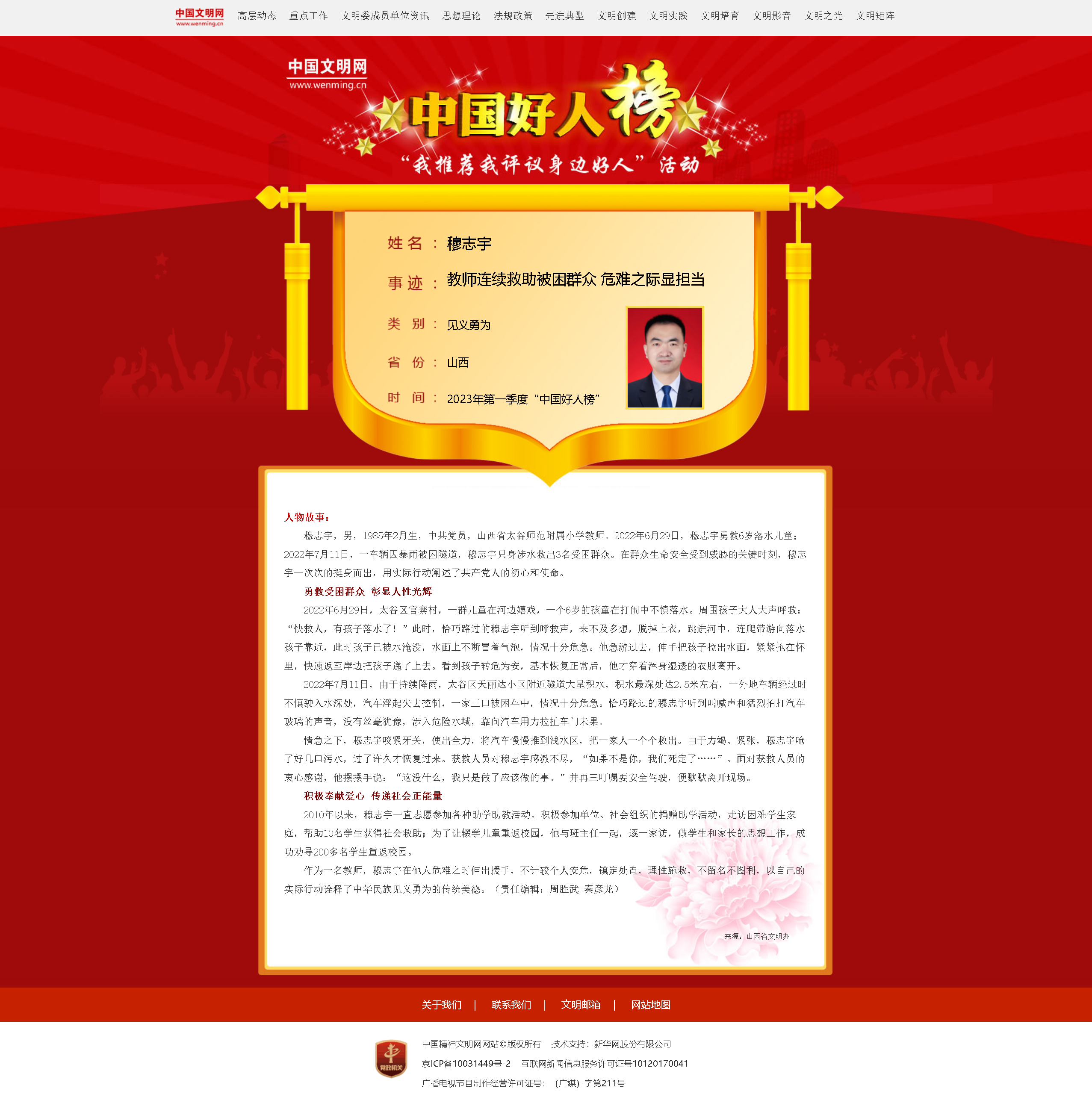 穆志宇,男,1985年2月生,中共党员,山西省太谷师范附属小学教师。2022年6月29日,穆志宇勇救6岁落水儿童;2022年7月11日,一车辆因暴雨被困隧道,穆志宇只身涉水救出3名受困群众。在群众生命安全受到威胁的关键时刻,穆志宇一次次的挺身而出,用实际行动阐述了共产党人的初心和使命。