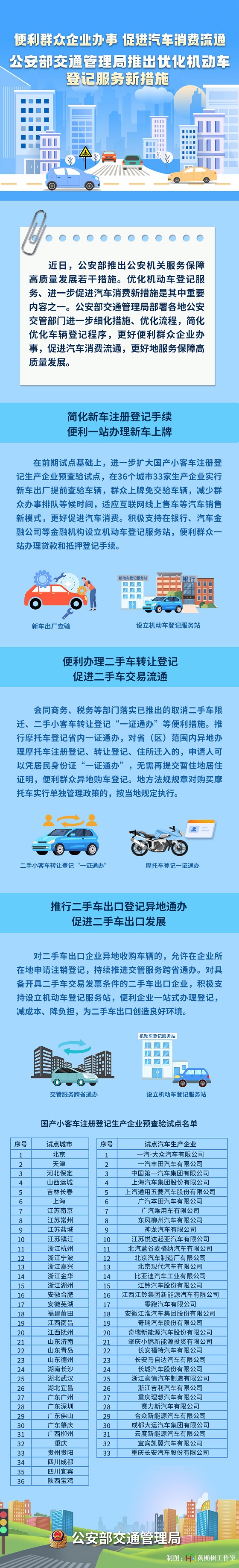 一、简化新车注册登记手续,便利一站办理新车上牌。在前期试点基础上,进一步扩大国产小客车注册登记生产企业预查验试点,在36个城市33家生产企业实行新车出厂提前查验车辆,群众上牌免交验车辆,减少群众办事排队等候时间,适应互联网线上售车等汽车销售新模式,更好促进汽车消费。积极支持在银行、汽车金融公司等金融机构设立机动车登记服务站,便利群众一站办理贷款和抵押登记手续。