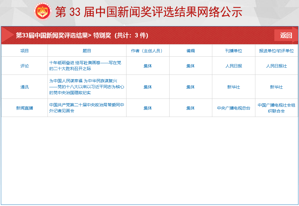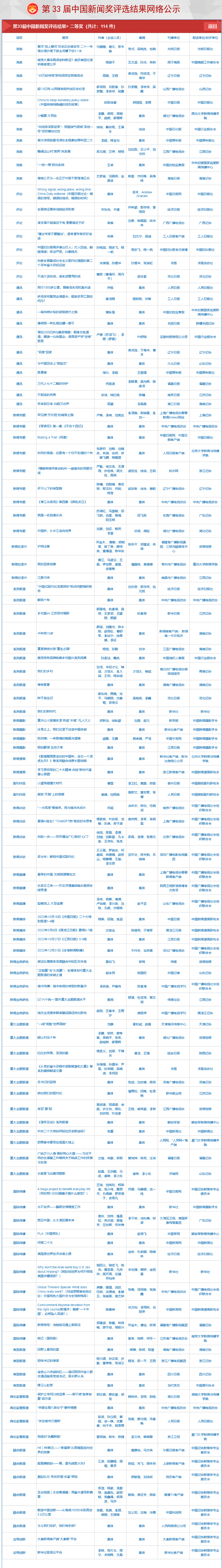 新华社北京9月20日电 自9月20日起,中国记协在中国记协微信公众号、中国记协网公示第三十三届中国新闻奖评选结果。本届中国新闻奖共评选出378件拟获奖作品,其中特别奖3件、一等奖74件、二等奖114件、三等奖187件。同时公示的还有本届《中国新闻奖评选细则》和评委名单。