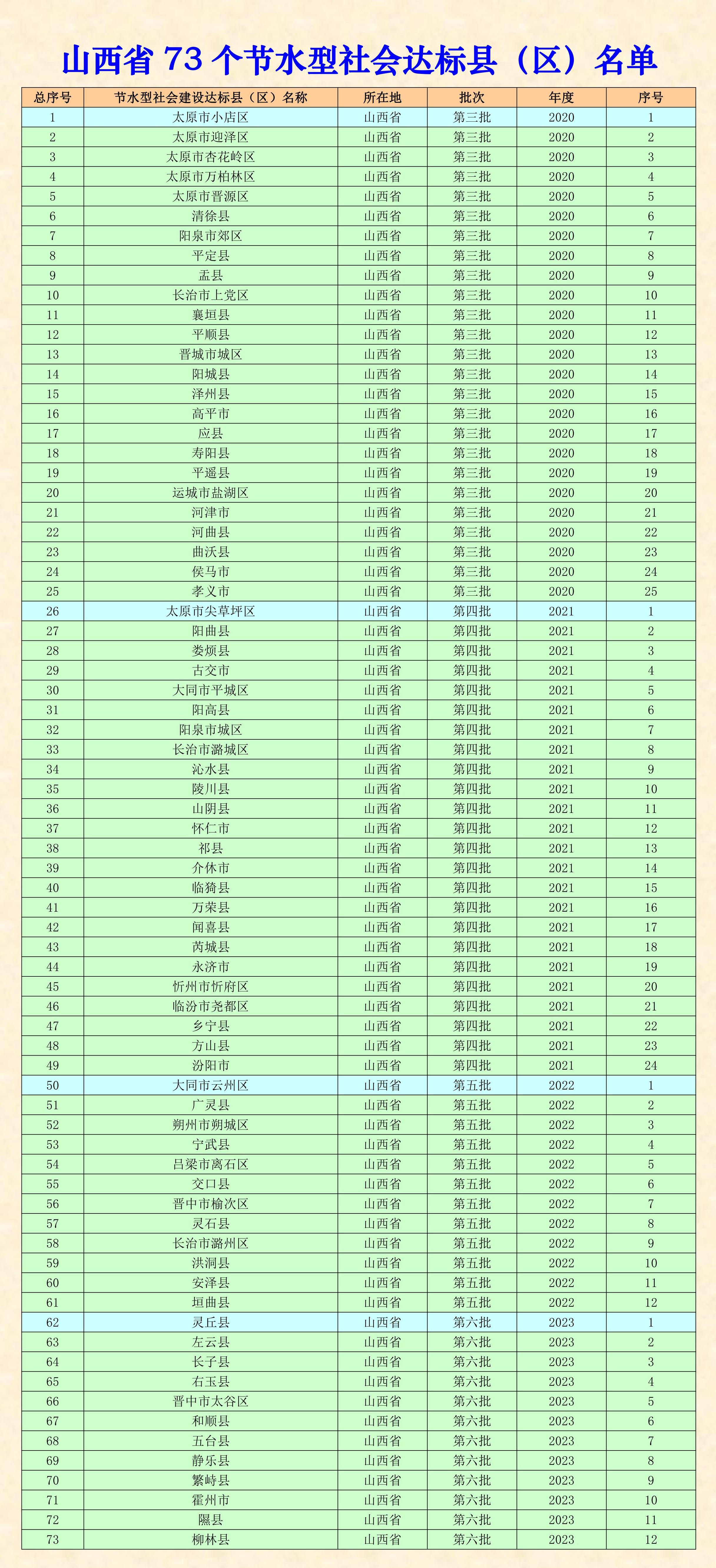 山西日报记者范珍报道 10月17日,记者获悉,水利部于近日公布第六批节水型社会建设达标县(区)名单,我省大同市灵丘县、左云县、长治市长子县、朔州市右玉县、晋中市太谷区、和顺县、忻州市五台县、静乐县、繁峙县、临汾市霍州市、隰县、吕梁市柳林县12个县(区)在列。截至目前,我省已有73个县(区)先后被水利部命名为节水型社会达标县,达标县命名率达到62.3%,提前达到了国家《十四五节水型社会规划》中要求的:到2025年底,北方地区60%以上县(区)级行政区达到节水型社会标准的目标。